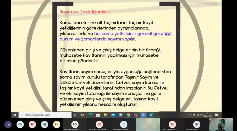 Resmi Yazışma Esasları ve Taşınır Mal Yönetmeliği eğitimini 27 Ocak 2021 Çarşamba günü saat 10.00'da Genel Sekreter Yardımcısı Fazlı ÖZTEL online olarak gerçekleştirdi. Eğitimin sonunda dinleyicilerin soruları cevaplandırıldı.
