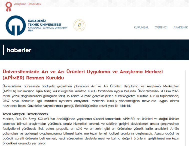 KTÜ Arı ve Arı Ürünleri Uygulama ve Araştırma Merkezi’nin (APİMER) kuruluşu, yerel ve ulusal düzeyde farklı gazete ve yayın organlarında yer buldu. Merkezin kuruluş sürecine ilişkin haberler, basın aracılığıyla kamuoyuna aktarılırken, APİMER’in arı ve arı ürünleri alanında yürütmeyi hedeflediği çalışmalar da genel hatlarıyla paylaşılmıştır. APİMER olarak, kuruluş sürecimize gösterilen ilgi ve desteğin, merkezin tanınırlığına ve faaliyetlerinin daha geniş kitlelere ulaşmasına katkı sağlayacağı değerlendirilmektedir.