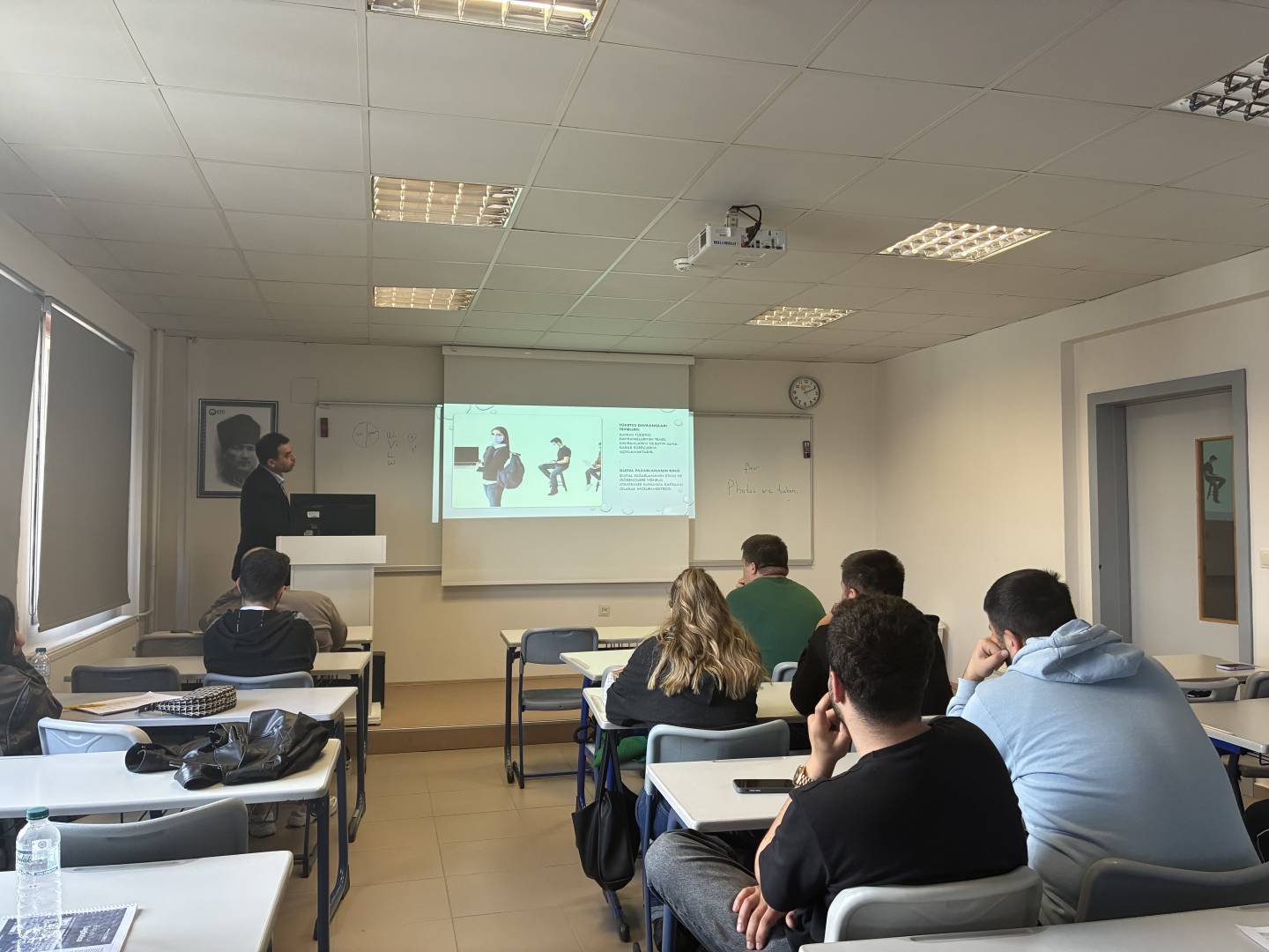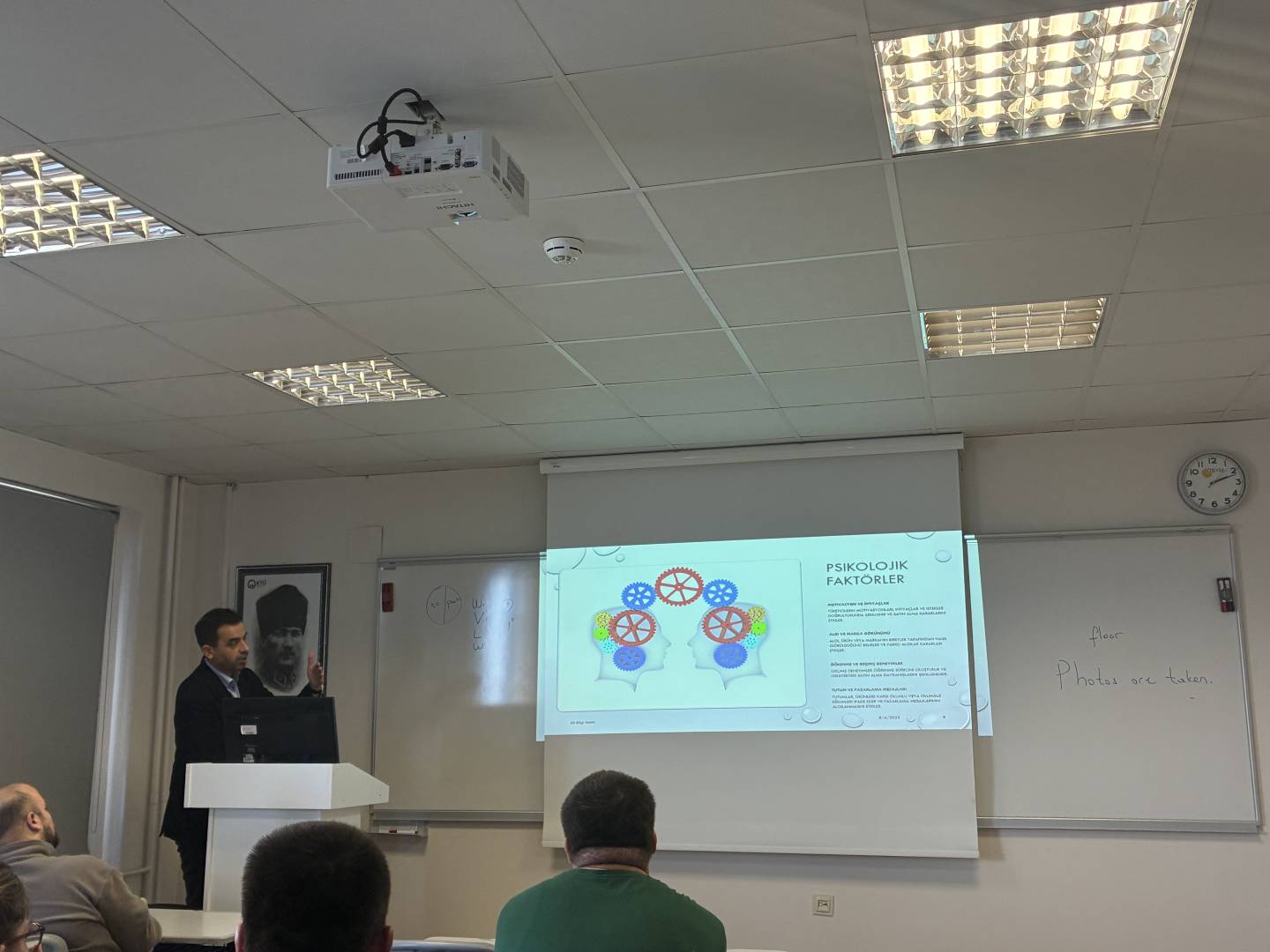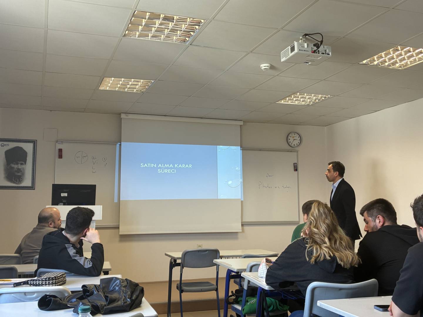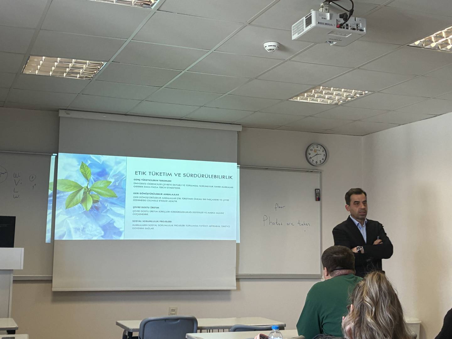 KALAYCI, sunumunda, tüketicilerin satın alma tercihlerini etkileyen kişisel, psikolojik ve kültürel faktörler, satın alma sonrası süreçler ve tüketici geri bildirimleri hakkında detaylı bilgiler verdi. Pazarlamada etik ve sürdürülebilirlik konusuna değinen KALAYCI, güncel yaklaşımlar kapsamında şirketlerin tüketici odaklılıktan tüketici takıntılılığa evrilmesini; veri toplama, davranış analizi ve satış sonrası süreçlerde yapay zeka ile dijital dönüşümün yeri ve önemini sahadan örneklerle açıkladı. Karşılıklı yoğun etkileşimle geçen ders içi etkinlik, soru cevap kısmının ardından Öğr. Gör. Dr. Damla EKER tarafından Levent KALAYCI'ya teşekkür belgesi verilmesinin ardından son buldu.