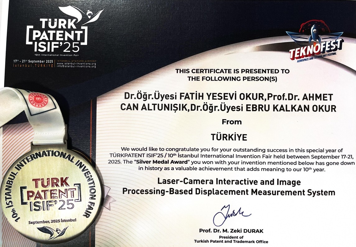 Yapı Sağlığı İzleme alanında geliştirilen “Laser-Camera Interactive and Image Processing-Based Displacement Measurement System” başlıklı çalışma, 470 buluş arasından öne çıkarak Gümüş Madalya (Silver Medal Award) ile ödüllendirilmiştir.