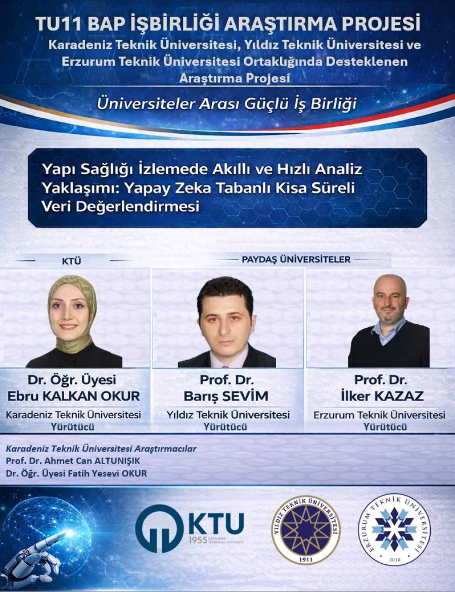 Karadeniz Teknik Üniversitesi yürütücülüğünde, Yıldız Teknik Üniversitesi ve Erzurum Teknik Üniversitesi paydaşlığında yürütülecek “Yapı Sağlığı İzlemede Akıllı ve Hızlı Analiz Yaklaşımı: Yapay Zeka Tabanlı Kısa Süreli Veri Değerlendirmesi” başlıklı proje destek almaya hak kazanmıştır.