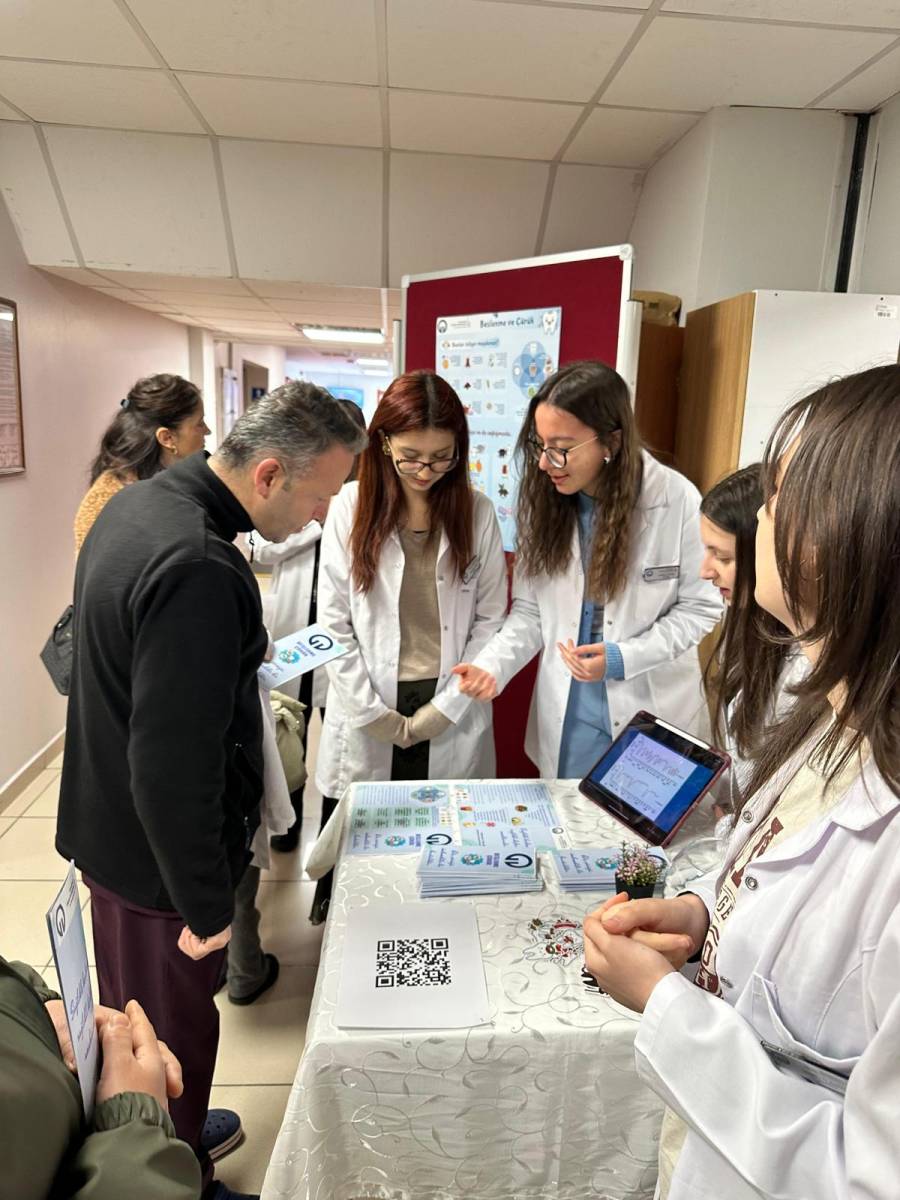 Etkinlik kapsamında öğrencilerimiz Beyza Pamuk, Yağmur Özmen, Hüsna Kevser Mercan, Bengisu Yılmaz ve Sümeyye Karal tarafından, Restoratif Diş Tedavisi ve Endodonti Anabilim Dalları hasta bekleme alanında kurulan bilgilendirme standı aracılığıyla hastalara yönelik olarak beslenme alışkanlıklarının diş çürüğü oluşumu üzerindeki etkileri, çürükten korunma yolları ve ağız sağlığının korunmasında doğru beslenmenin önemi hakkında bilgilendirmeler yapıldı.