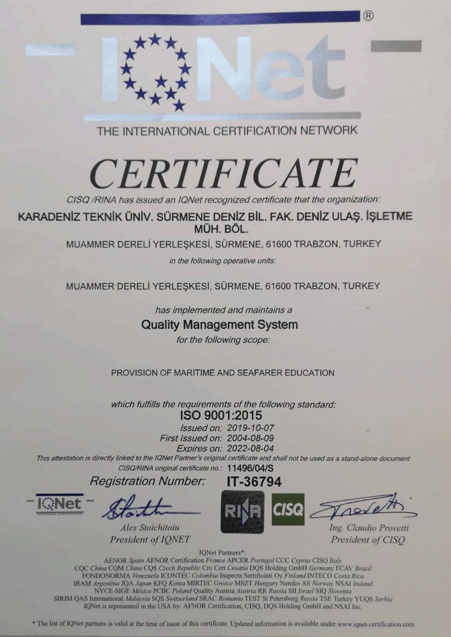 The Quality Management System, implemented by the Department of Maritime Transportation and Management Engineering in the Surmene Faculty of Marine Sciences at KTU in the field of "Maritime and Seafarer Education", successfully passed the audit by the international accreditation organization RINA on 15.09.2021, and ISO 9001:2015 certification is received.
