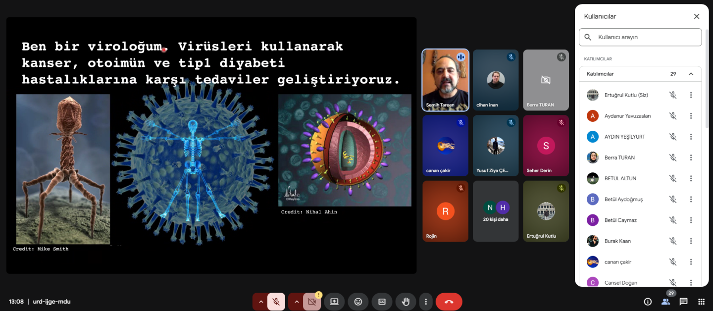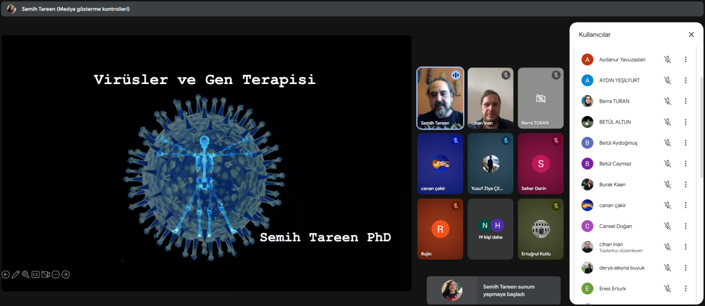 Sunum, Sana Biyoteknoloji şirketinden virolog Dr. Semih Tareen tarafından gerçekleştirildi. Etkinlikte, virüslerin biyolojik özellikleri, gen terapisi uygulamalarındaki rolleri ve güncel bilimsel gelişmeler ele alındı.