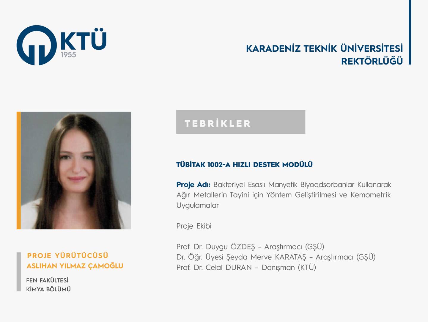 Fakültemiz Kimya Bölümü öğretim elemanlarından Arş. Gör. Aslıhan YILMAZ ÇAMOĞLU’nun "Bakteriyel Esaslı Manyetik Biyoadsorbanlar Kullanarak Ağır Metallerin Tayini için Yöntem Geliştirilmesi ve Kemometrik Uygulamalar" başlıklı projesi “TÜBİTAK 1002-A Hızlı Destek Modülü” kapsamında desteklenmiştir.