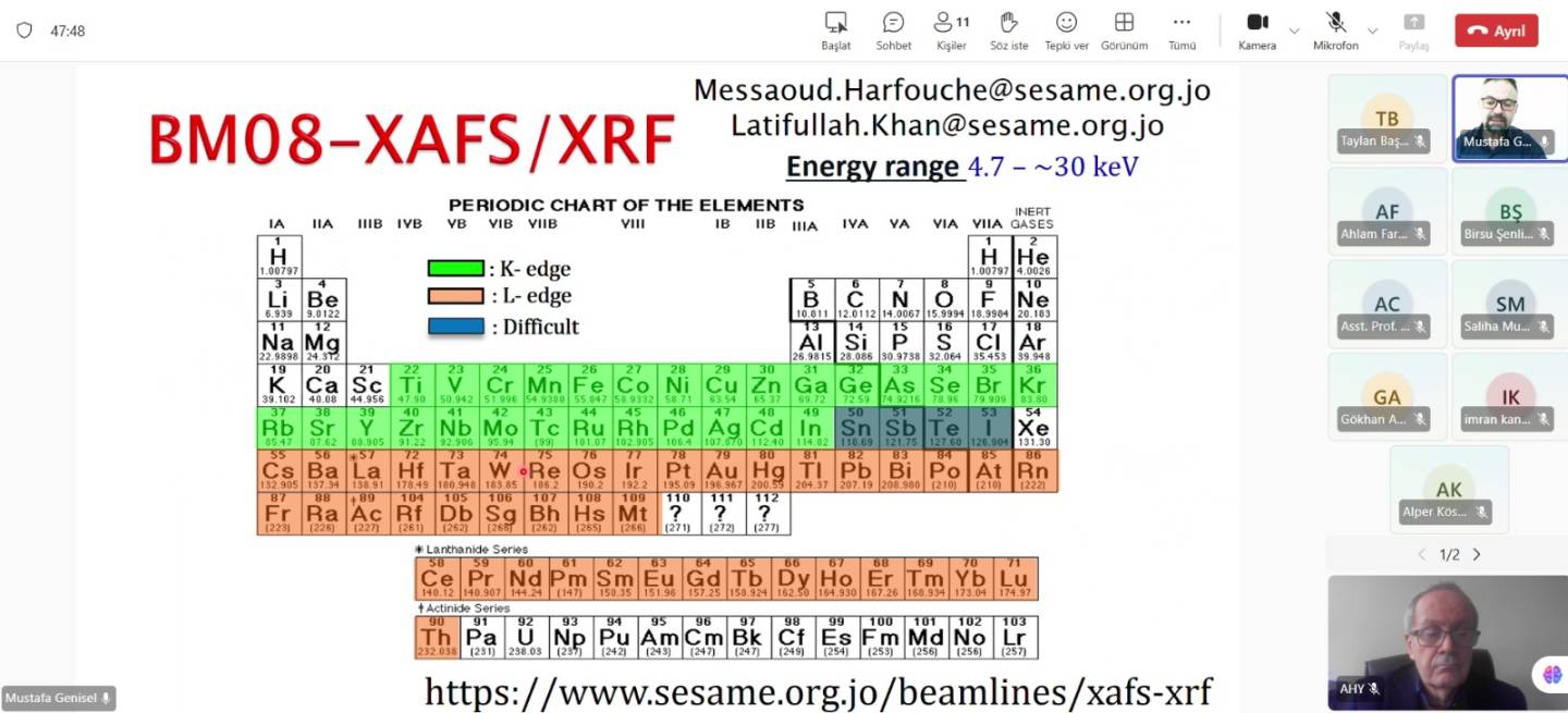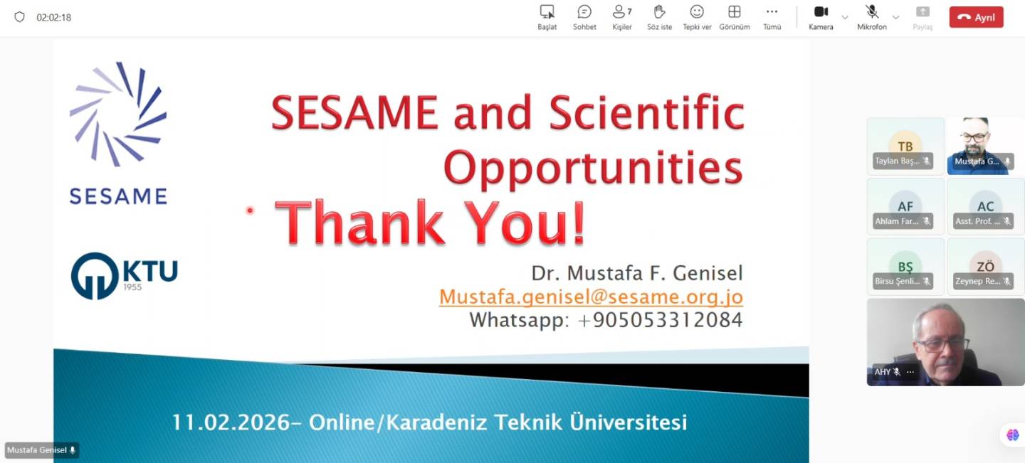 11.02.2026 Çarşamba günü Fizik Bölümü etkinlikleri kapsamında, Ortadoğu’nun Uluslararası Sinkrotron Işığı Mükemmeliyet Merkezi; SESAME’den (Synchrotron-light for Experimental Science and Applications in the Middle East), HESEB Demethattı Sorumlusu Dr. Mustafa Fatih GENİŞEL “SESAME ve Araştırma Olanakları” başlıklı bir çevrimiçi seminer gerçekleştirdi. Ürdün SESAME’den gerçekleştirilen bu seminer kapsamında, Dr. Mustafa Fatih GENİŞEL tarafından Türkiye’nin de ortağı olduğu bu araştırma laboratuvarındaki sinkrotron ışığının bilim ve teknolojideki kritik rolü, SESAME’nin sunduğu ileri araştırma olanakları, demet hatları ve kullanıcı olma süreçleri ayrıntılı olarak ele alındı.