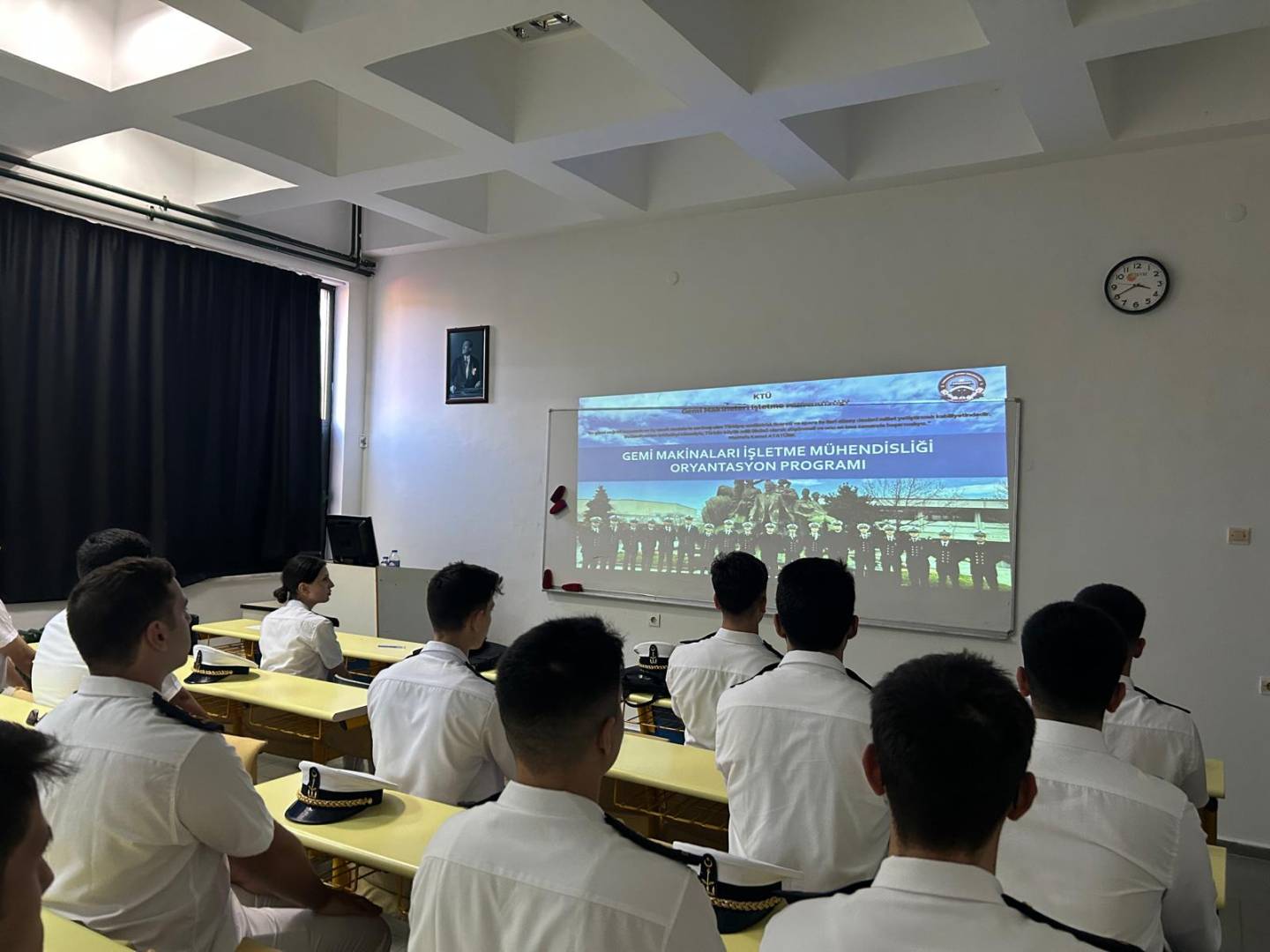 Arş. Gör. Abdülkadir Coşkun ve Arş. Gör. Aleyna Ulucutsoy tarafından yapılan oryantasyon programı kapsamında; bölüm akademik ve idari personelinin tanıtımı, ders ve staj süreçleri hakkında bilgilendirme, bölüm yerleşke bilgileri ve ulaşım imkanları aktarılmıştır. Ayrıca, bölüm içi etkinlikler ve Gemi Makineleri İşletme Mühendisliği Kulübü hakkında öğrencilerimize bilgi verilmiştir.