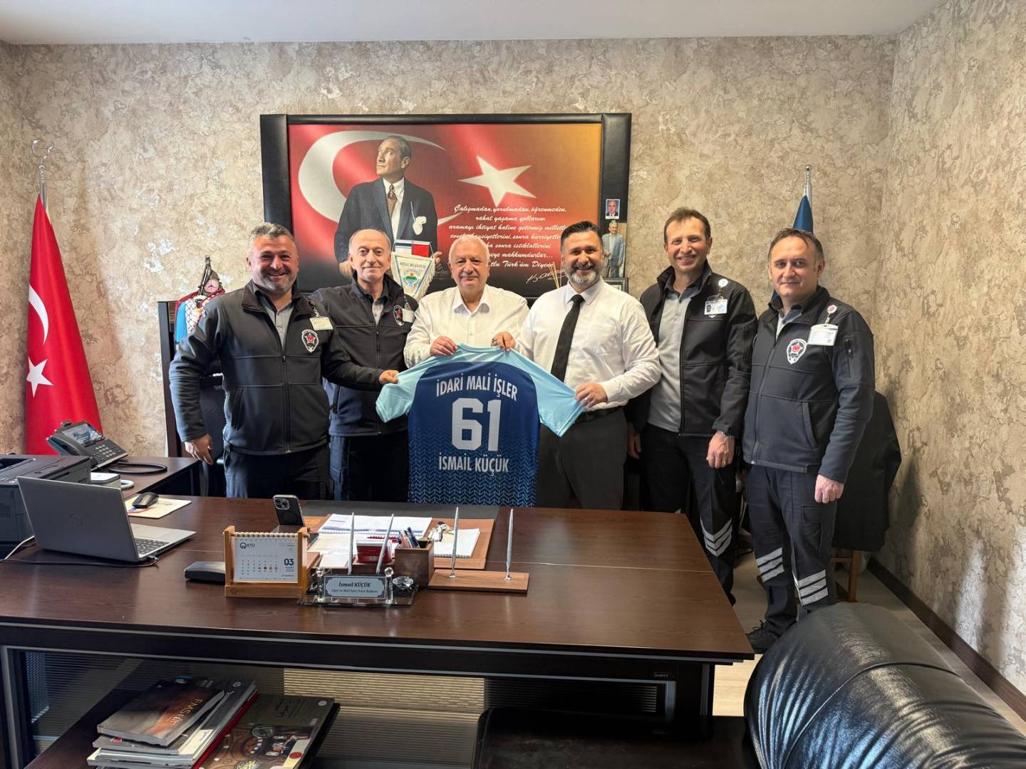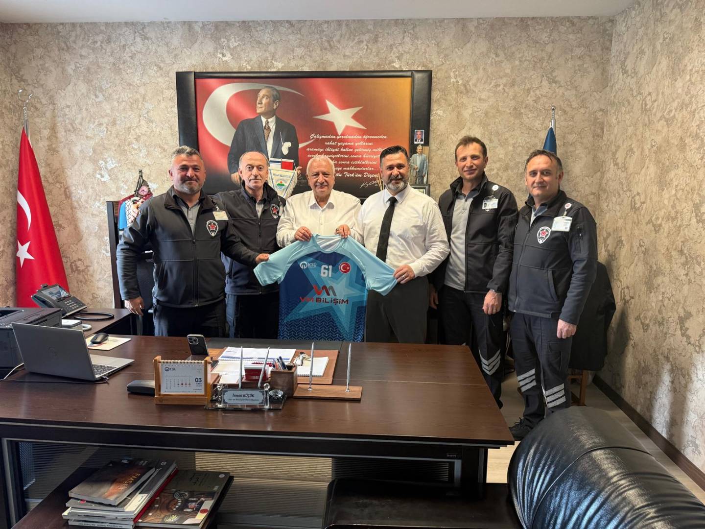44. Spor Şölenine hazırlık sürecince takım kaptanlarımız ile birlikte Daire Başkanımıza bir ziyaret gerçekleştirdik. Geçen yıl ki başarı ve bu yılın hazırlık süreçlerinin konuşulduğu toplantıda, yeni formamızın ilk örneğini takıma verdiği desteklerinden dolayı İdari ve Mali İşler Daire Başkanımız İsmail KÜÇÜK'e hediye ettik.