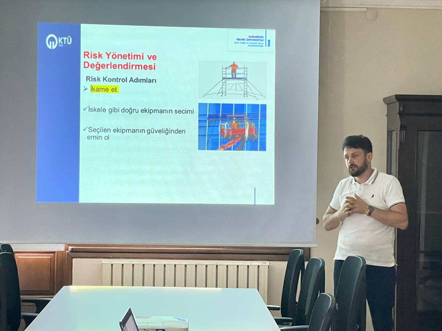 Karadeniz Teknik Üniversitesi İşyeri Sağlık ve Güvenlik Koordinatörlüğü tarafından, İstanbul’da düzenlenecek TEKNOFEST organizasyonunda görev alacak marangoz atölyesi çalışanlarına yönelik “Yüksekte Çalışma Eğitimi” düzenlendi.