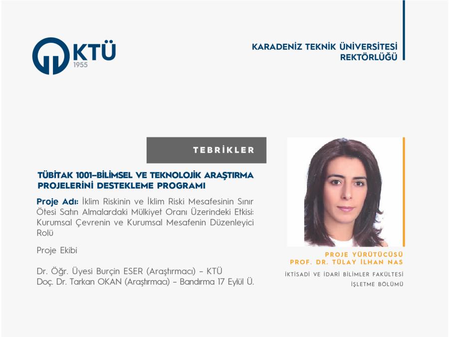 Karadeniz Teknik Üniversitesi İşletme Bölümü Öğretim Üyesi Prof. Dr. Tülay İLHAN NAS’ın "İklim Riskinin ve İklim Riski Mesafesinin Sınır Ötesi Satın Almalardaki Mülkiyet Oranı Üzerindeki Etkisi: Kurumsal Çevrenin ve Kurumsal Mesafenin Düzenleyici Rolü" başlıklı projesi TÜBİTAK 1001–“Bilimsel ve Teknolojik Araştırma Projelerini Destekleme Programı” kapsamında destek almaya hak kazandı.