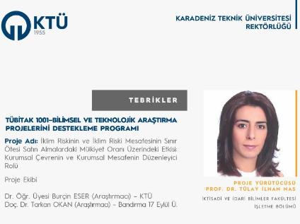 Bölümümüz Öğretim Üyesi Prof. Dr. Tülay İLHAN NAS'a TÜBİTAK Proje Desteği