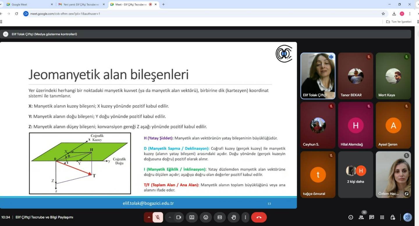 Sunumda, Dünya’nın manyetik alanının oluşumu, bu alanın zamansal değişimi, jeomanyetik gözlemevlerinin işleyişi ve jeomanyetik fırtınaların teknolojik sistemler üzerindeki etkileri gibi temel konular ele alındı. Ayrıca jeofizik mühendisliğinin manyetizma alanındaki uygulamaları ve güncel uzay havası olaylarının iyonosfer ve GNSS sistemleri üzerindeki etkilerine dair örnekler paylaşıldı.