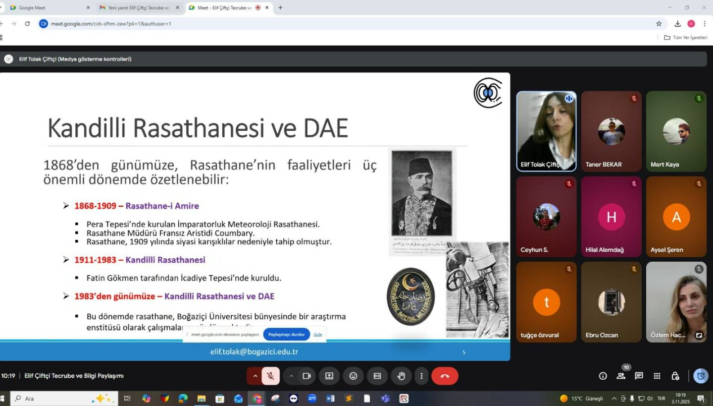 Karadeniz Teknik Üniversitesi Fen Bilimleri Enstitüsü Jeofizik Mühendisliği Anabilim dalı tarafından düzenlenen etkinlikte, Boğaziçi Üniversitesi Kandilli Rasathanesi ve Deprem Araştırma Enstitüsü Jeomanyetizma Laboratuvarı araştırmacısı Jeofizik Yük. Müh. Elif Çiftçi, “Yer Manyetik Alanı Üzerine Çalışmalar ve Mesleki Uygulama Alanları” başlıklı sunumunu gerçekleştirdi.
