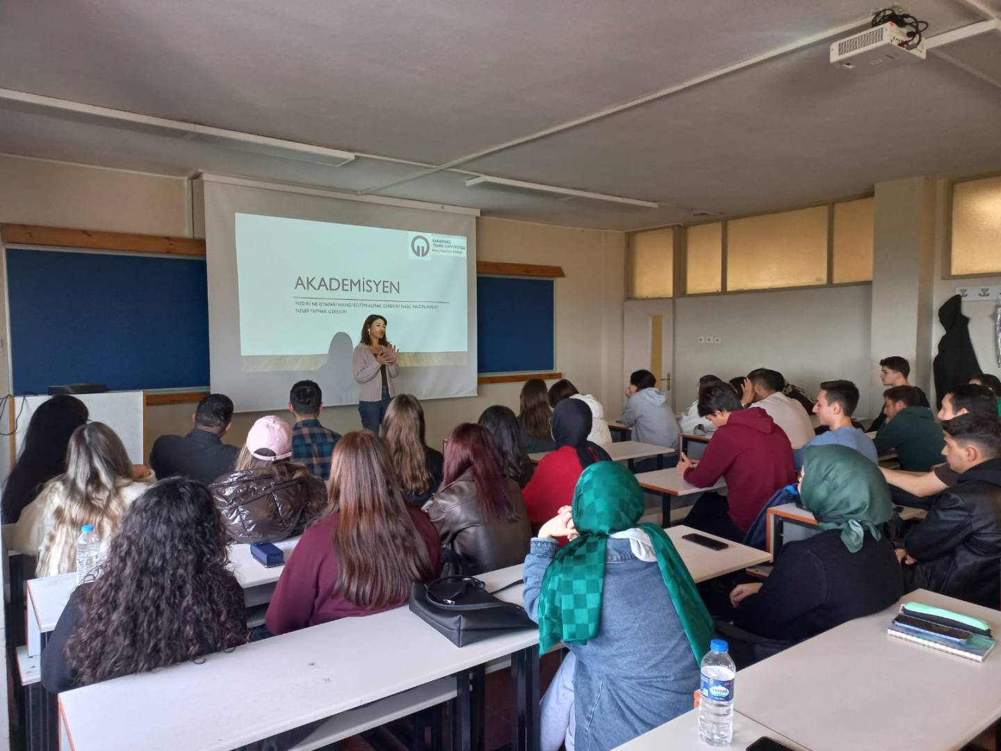 Etkinlik kapsamında Doç. Dr. Nisa Erdem, öğrencilere akademik kariyer süreci, akademisyenlik mesleğinin aşamaları ve akademik hayatta dikkat edilmesi gereken noktalar hakkında kapsamlı bir sunum yaptı.