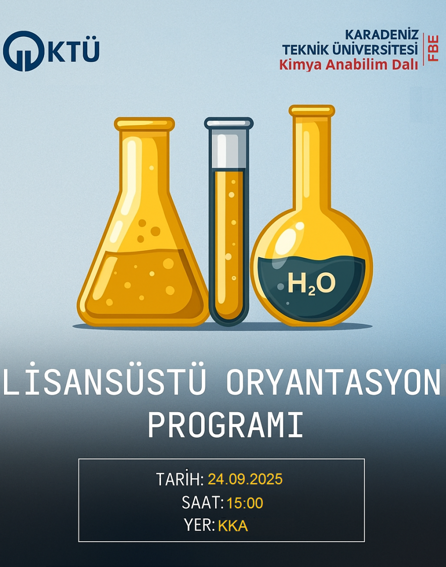 Anabilim Dalımız Tarafından Lisansüstü Öğrenciler İçin Düzenlenecek Oryantasyon ve Bilgilendirme Programı 24 Eylül 2025 Çarşamba Günü Saat 15.00’te Kimya Bölümü Küçük Amfisinde Gerçekleştirilecektir.