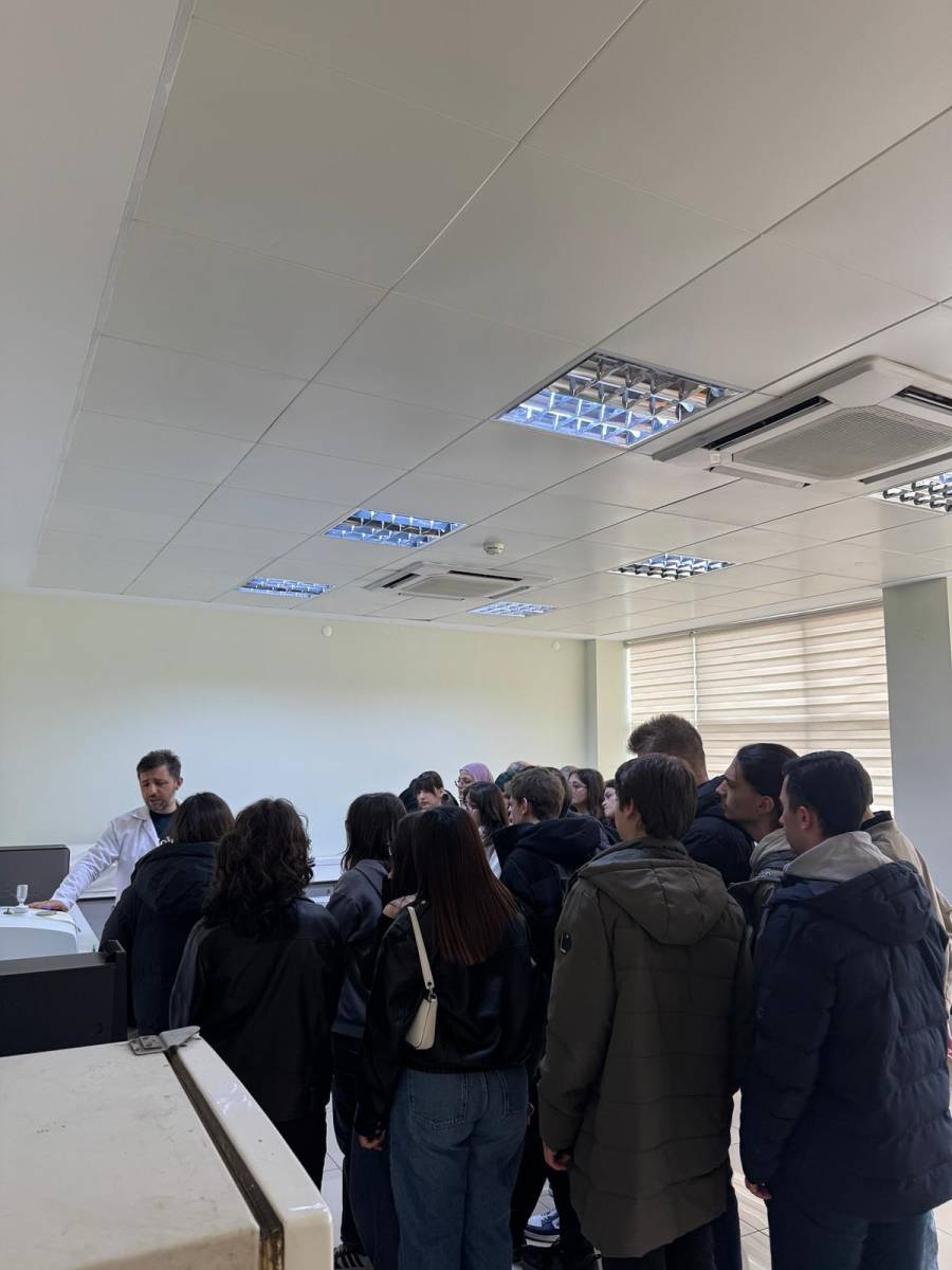 Programın devamında öğrenciler, bölüm laboratuvarlarını ziyaret ederek uygulamalı çalışma alanlarını yakından inceleme fırsatı buldu. Öğretim üyemiz Dr. Öğr. Üyesi Hüseyin Baş, laboratuvar ortamında gerçekleştirilen deneysel çalışmalar hakkında bilgi vererek kullanılan cihazlar, deney düzenekleri ve temel laboratuvar ekipmanlarını tanıttı. Ayrıca bilimsel araştırma süreçlerinin planlama, uygulama ve değerlendirme aşamaları detaylandırılarak kimya biliminin günlük yaşamla olan ilişkisi somut örnekler üzerinden açıklandı.