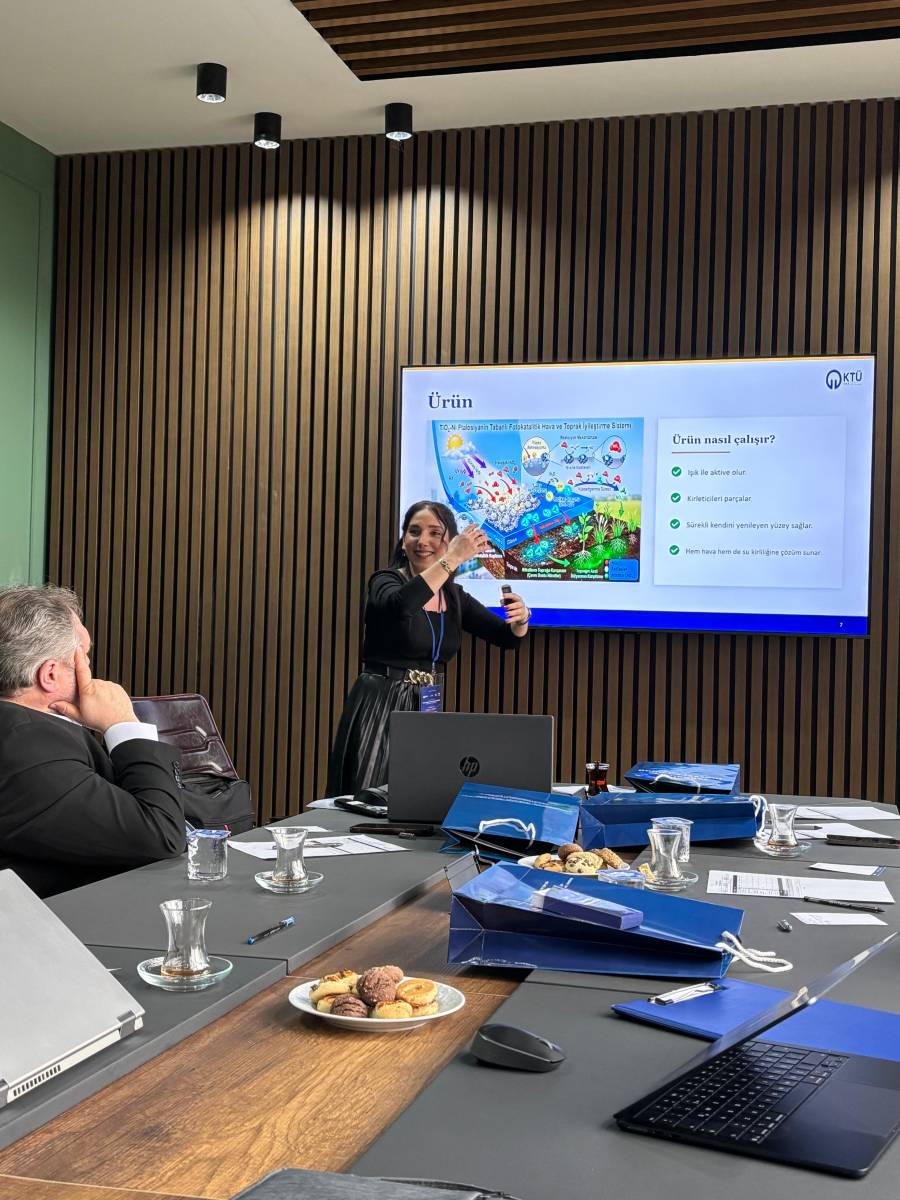 Sunumu Yapan: Hilal Fazlı. Patent Adı: Yüksek Fotokatalitik Etkili İç ve Dış Mekan Kaplama Malzemesi. Buluşçular: Hilal Fazlı, Prof. Dr. Zekeriya Bıyıklıoğlu, Doç. Dr. Ömer Kesmez.