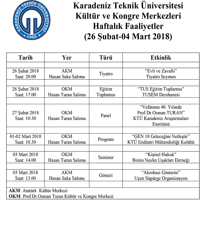 26 Şubat-04 Mart 2018 Haftalık Faaliyetler