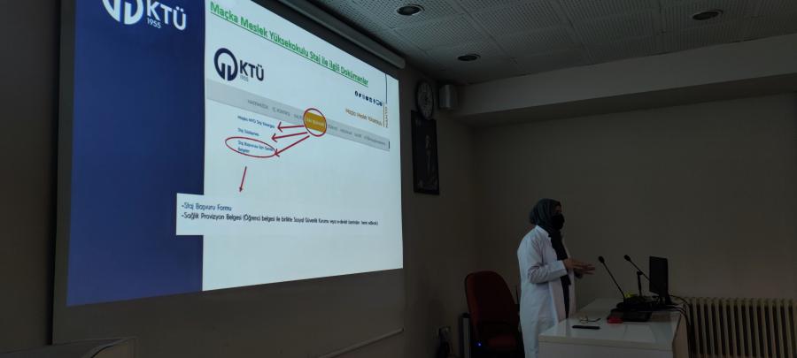 Maçka Meslek Yüksekokulu Müdür yardımcı Prof. Dr. Hacer BAYRAK tarafından Yüksekokulumuz 1. sınıf öğrencilerine 12.01.2022 ve 2. sınıf öğrencilerine 17.01.2022 tarihlerinde, her bölüme ayrı oturumlar halinde Staj Yönetim Sistemi hakkında bilgilendirme sunumları yapıldı.