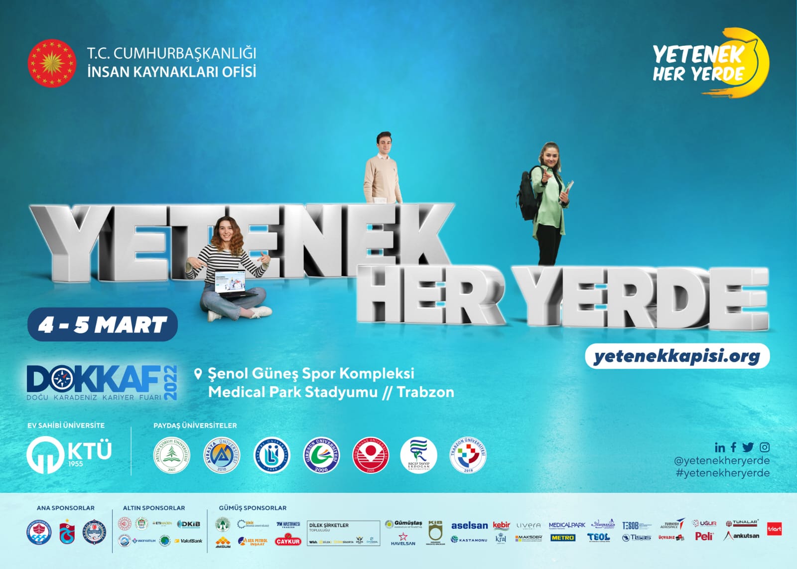 Türkiye Cumhuriyeti Cumhurbaşkanlığı koordinasyonunda, Karadeniz Teknik Üniversitesi ev sahipliğinde bölgemizdeki yedi üniversitenin paydaşlığında “Doğu Karadeniz Kariyer Fuarı (DOKKAF)” 4-5 Mart 2022 (Cuma, Cumartesi) tarihlerinde Şenol GÜNEŞ Spor Kompleksi Medical Park Stadyumunda gerçekleşecektir. Her bölümden öğrencilerine ve mezunlarına yönelik yüzlerce firmanın yer alacağı bu kapsamlı fuarda, mezun ve mezun adayları için iş imkânı, öğrenciler için staj imkânı bulabilecekleri bir ortam oluşturulacaktır.