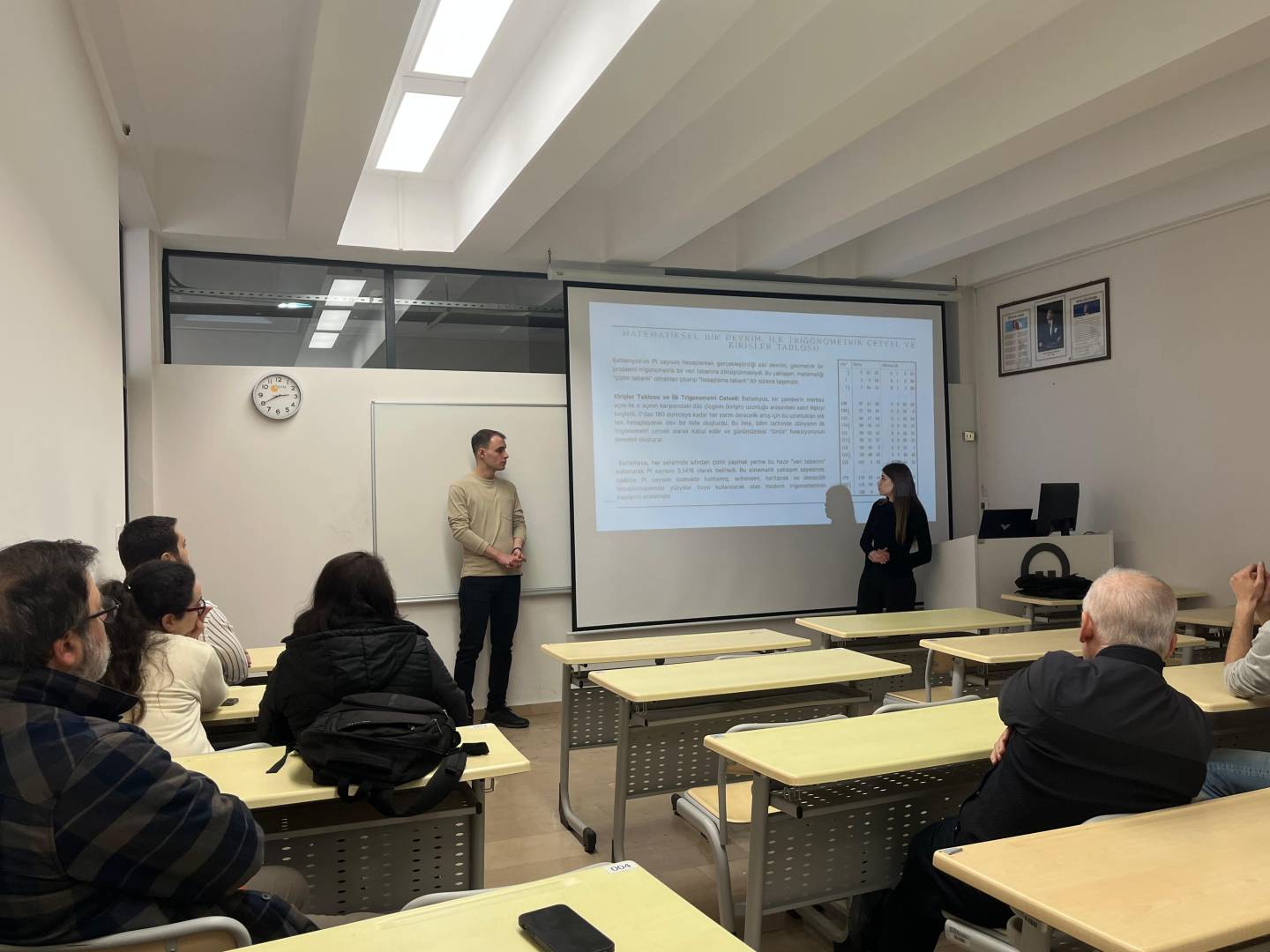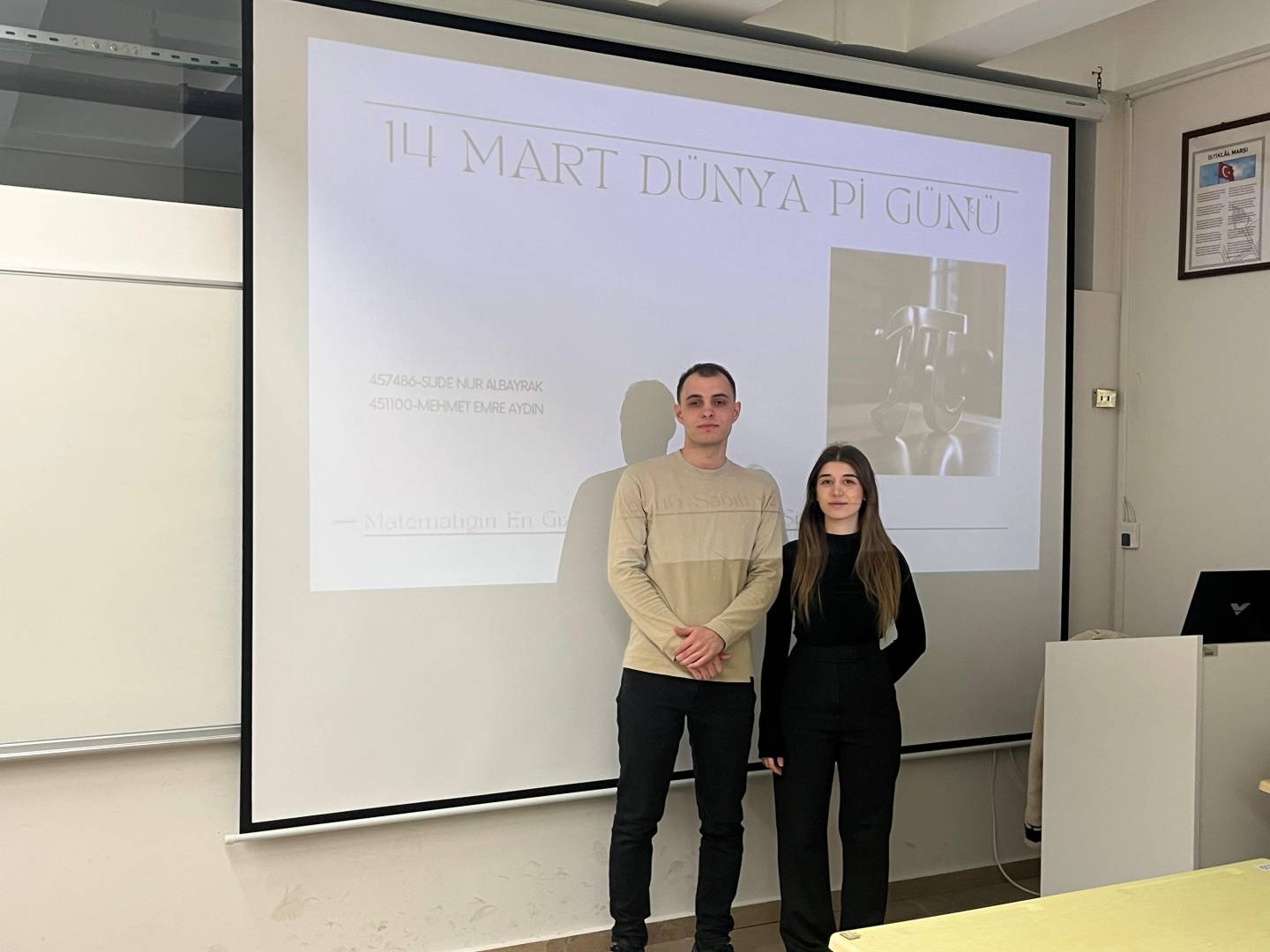 Her yıl 14 Mart’ta kutlanan Dünya Pi Günü etkinlikleri kapsamında, matematiğin bilimsel ve felsefi önemine dikkat çekmek amacıyla lisansüstü öğrencilerimiz Mehmet Emre Aydın ve Sude Nur Albayrak tarafından “Pi’nin Hikayesi: Keşfi ve Doğadaki İzleri” başlıklı bir sunum gerçekleştirilmiştir. Etkinlikte, Pi sayısının tarihsel gelişiminin yanı sıra matematikteki ve doğadaki yeri geniş bir perspektifle ele alınarak katılımcılarla paylaşılmıştır.