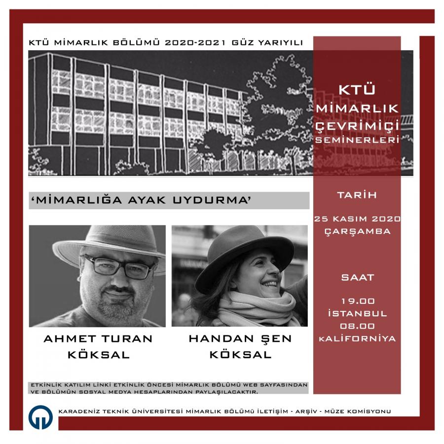 Karadeniz Teknik Üniversitesi Mimarlık Bölümü İletişim-Arşiv-Müze Komisyonu tarafından düzenlenen Mimarlık Bölümü Çevrimiçi Seminerleri kapsamında 25 Kasım 2020 Çarşamba günü saat 19.00’da Ahmet Turan Köksal ve Handan Şen Köksal ‘Mimarlığa Ayak Uydurma’ konulu semineri ile bizlerle buluşacaklardır. Akademik personelimize ve öğrencilerimize önemle duyurulur.