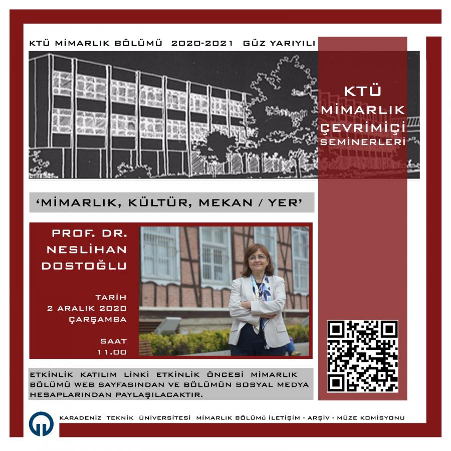 Karadeniz Teknik Üniversitesi Mimarlık Bölümü İletişim-Arşiv-Müze Komisyonu tarafından düzenlenen Mimarlık Bölümü Çevrimiçi Seminerleri kapsamında 2 Aralık 2020 Çarşamba günü saat 11.00’de Prof. Dr. Neslihan Dostoğlu ‘Mimarlık, Kültür, Mekân/Yer’ konulu semineri ile bizlerle buluşacaklardır. Akademik personelimize ve öğrencilerimize önemle duyurulur.