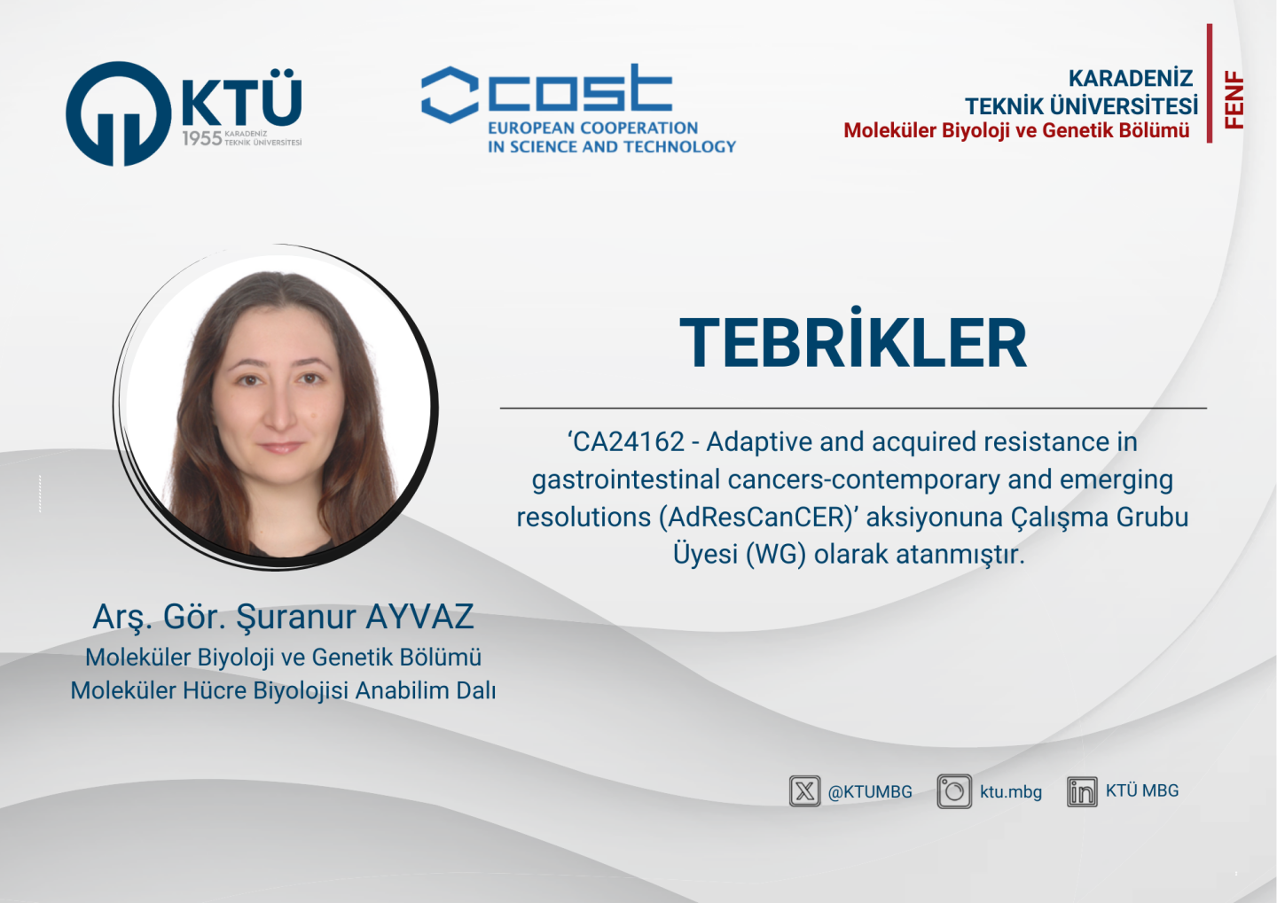 Bölümümüz öğretim elemanlarından Arş. Gör. Şuranur AYVAZ 'CA24162 - Adaptive and acquired resistance in gastrointestinal cancers-contemporary and emerging resolutions (AdResCanCER)' aksiyonuna Çalışma Grubu Üyesi (WG) olarak atanmıştır.