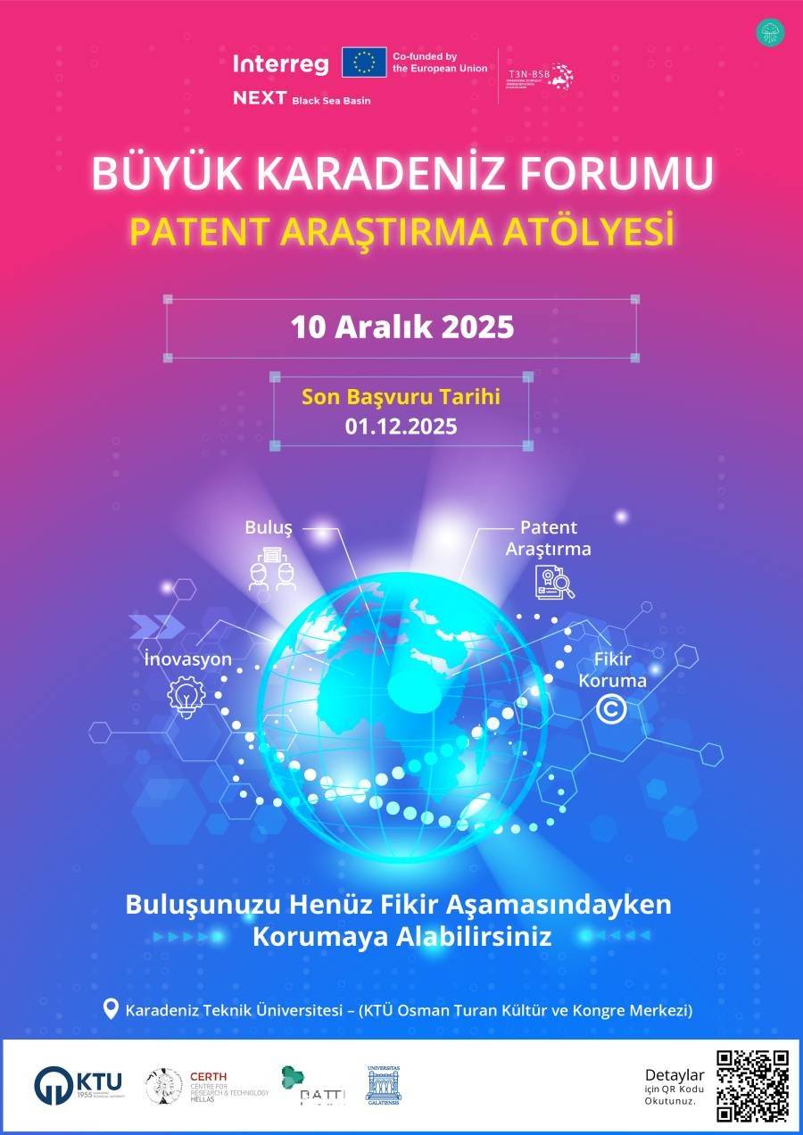 Karadeniz Teknik Üniversitesi Moleküler Biyoloji ve Genetik Bölümü Araştırma Görevlisi Aleyna Nalçaoğlu Şenocak, Büyük Karadeniz Forumu kapsamında düzenlenen Patent Araştırma Atölyesi’ne katılım sağladı. 10 Aralık 2025 tarihinde KTÜ Osman Turan Kültür ve Kongre Merkezi’nde gerçekleştirilen atölyede; buluş, inovasyon, patent araştırma süreçleri ve fikirlerin erken aşamada korunması konularında kapsamlı bilgiler paylaşıldı. Katılımcılar, fikir aşamasındaki çalışmaların nasıl korunabileceği ve patent araştırmalarının nasıl yürütülmesi gerektiğine dair uygulamalı içeriklerle bilgilendirildi. Avrupa Birliği tarafından desteklenen Interreg NEXT Black Sea Basin Programı kapsamında gerçekleştirilen etkinlik, akademisyenler ve araştırmacılar için fikri mülkiyet farkındalığının artırılması açısından önemli bir platform sundu.