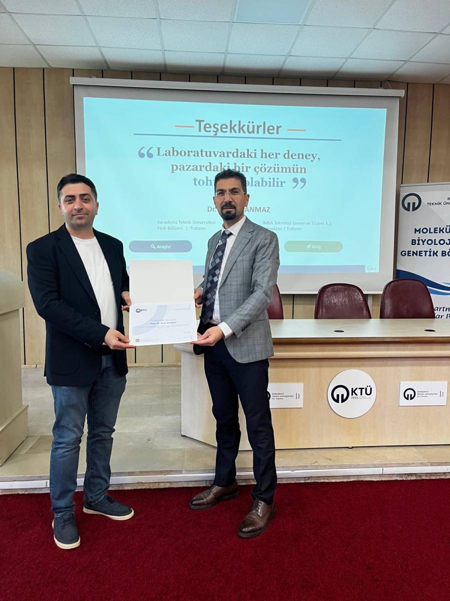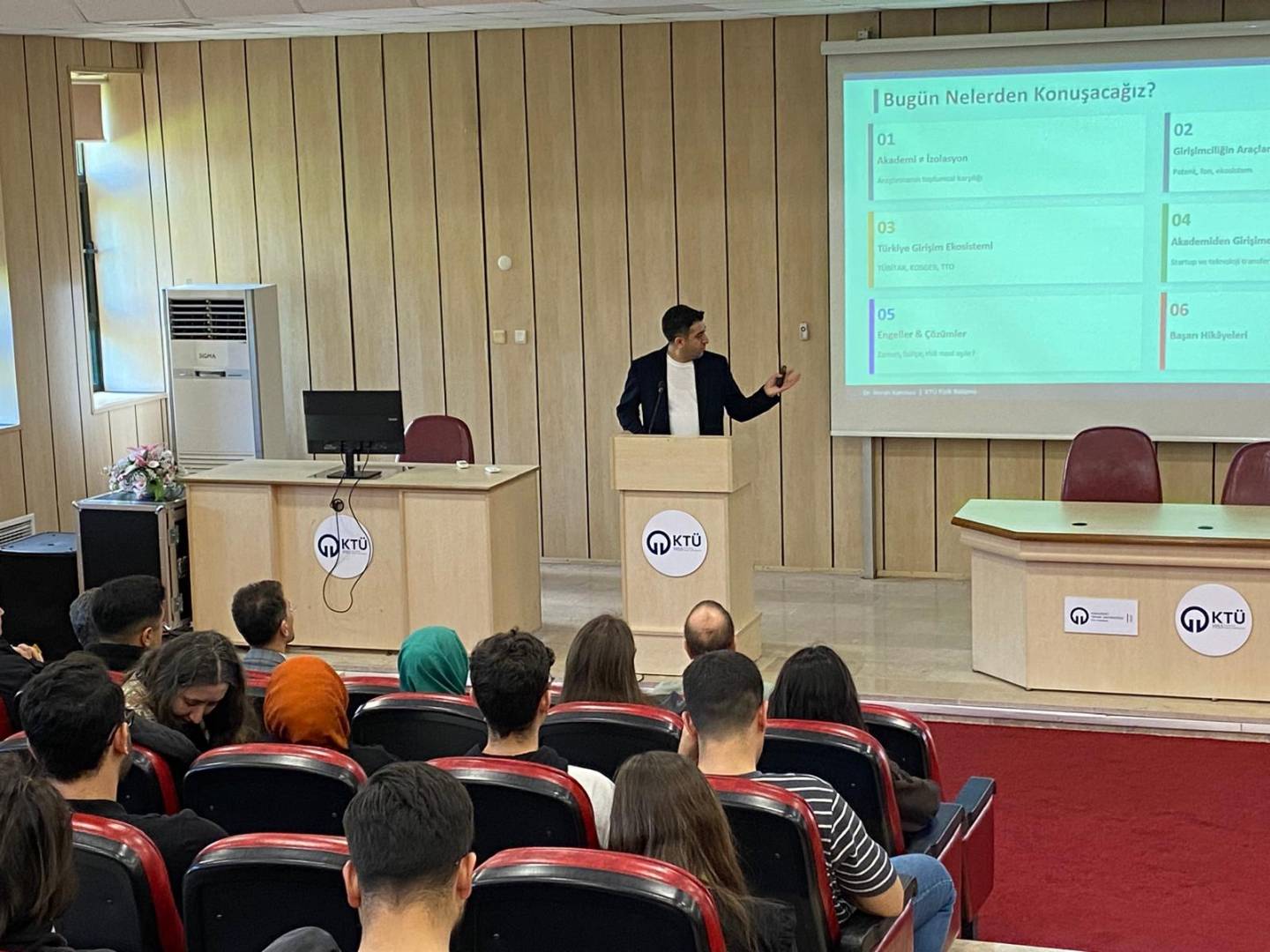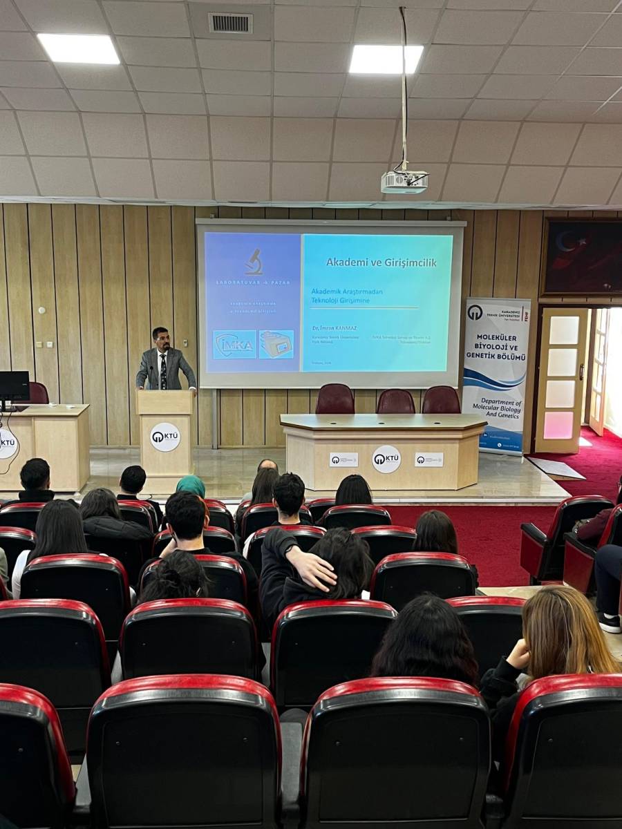 Karadeniz Teknik Üniversitesi Moleküler Biyoloji ve Genetik Bölümü tarafından, stratejik planda A1.H1.2.PG1.2.4- Sektör temsilcilerinin katıldığı ders kapsamında, MBG2024 Bilimsel Araştırma Yöntemleri dersi kapsamında düzenlenen “Akademi ve Girişimcilik” başlıklı etkinlik, 21 Nisan 2026 tarihinde Nazım Terzioğlu Amfisi’nde gerçekleştirildi.