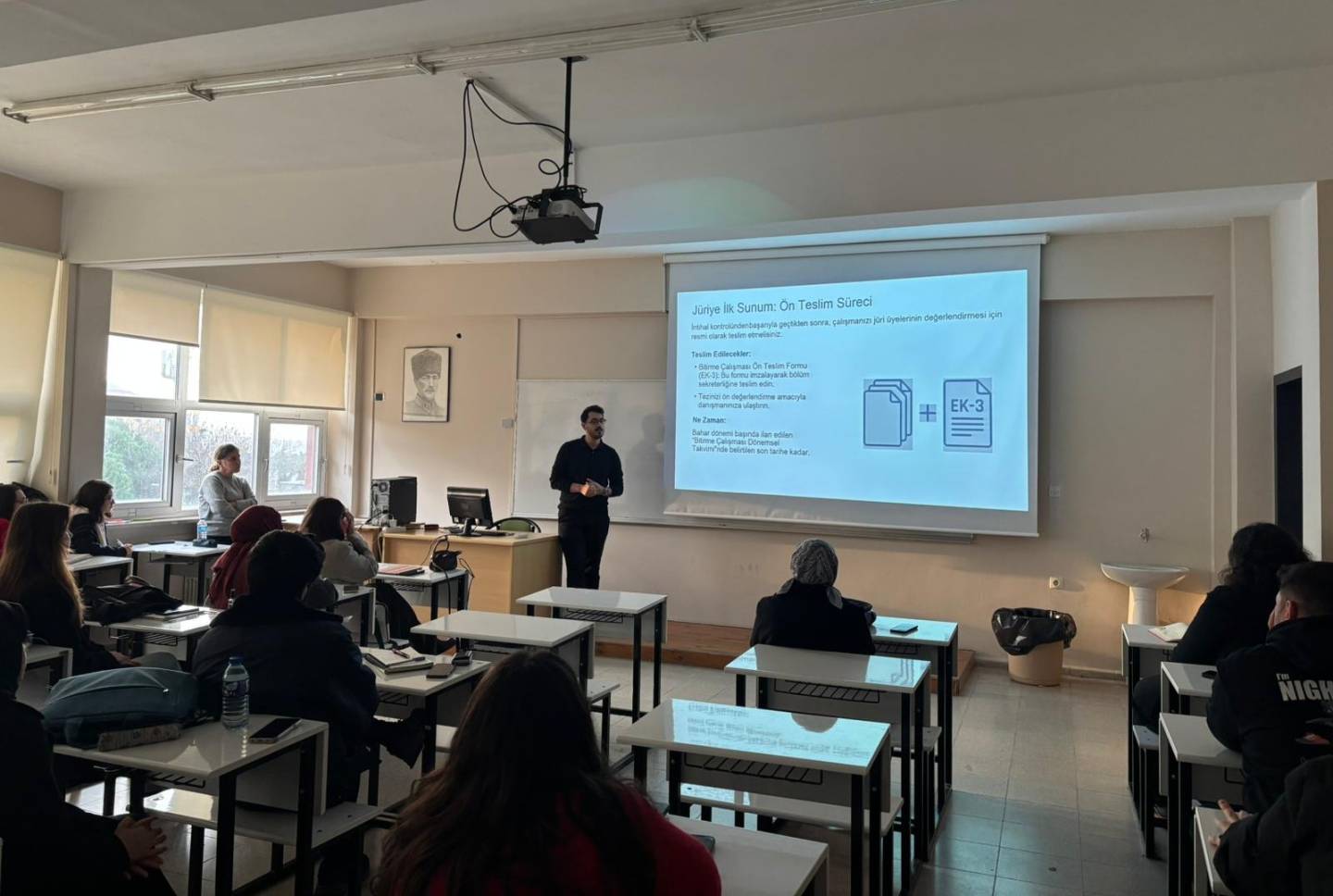 Gerçekleştirilen bilgilendirme kapsamında, bitirme çalışmasının amacı ve öğrenme çıktıları vurgulanırken; teorik ve uygulamalı çalışmaların nasıl planlanması gerektiği konusunda öğrencilere yol gösterici bilgiler sunuldu. Ayrıca, bitirme çalışması sürecinde karşılaşılabilecek olası sorunlar ve çözüm önerileri paylaşıldı.