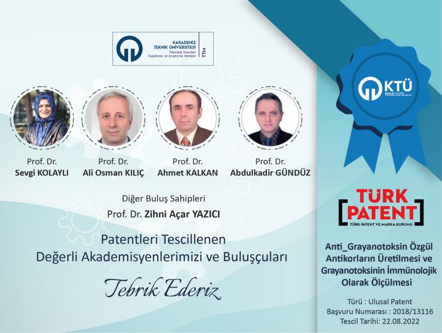 Patent başvurusu tescillenen akademisyenlerimizi ve buluşçuları tebrik eder, akademisyenlerimizin KTÜ Ekolüne verdiği katkılardan dolayı teşekkür ederiz.
