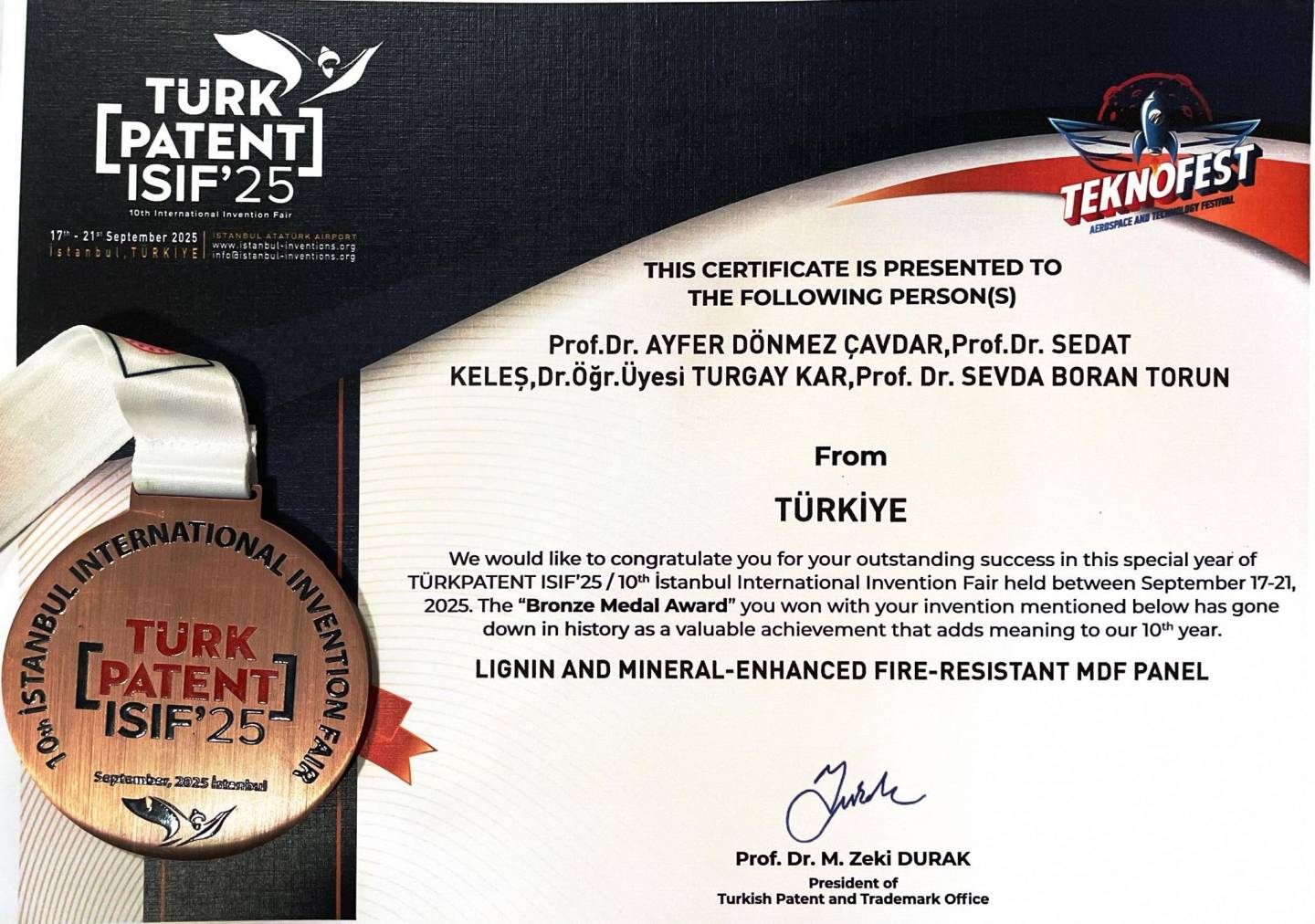 "Lignin ve Mineral Takviyeli Yangına Dayanıklı MDF Panel" ile ISIF’25 / TEKNOFEST 2025’te Bronz Madalya Ödülü kazanan bölümümüz öğretim üyesi Prof.Dr. Ayfer Dönmez Çavdar'ı ve ekibini tebrik ederiz!