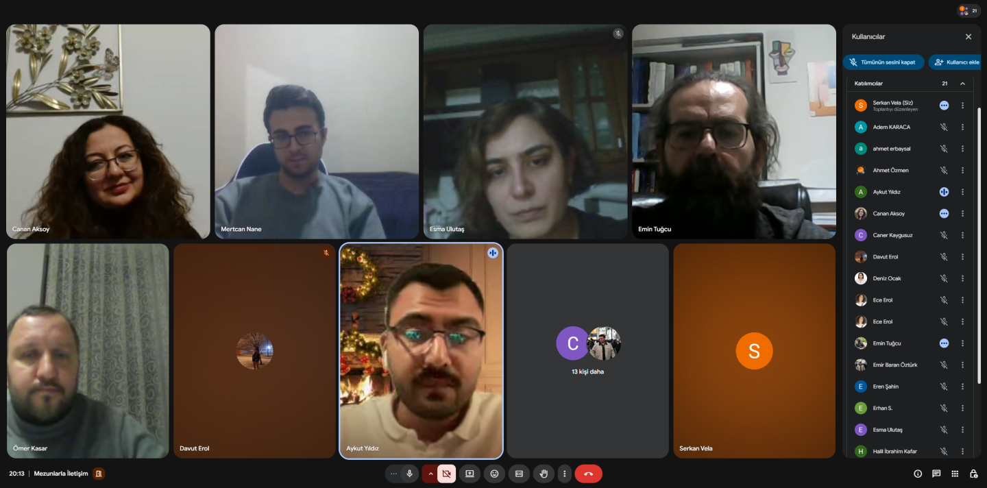 Google Meet üzerinden gerçekleştirilen toplantıda; mezunlarımızın kariyer süreçleri, bölümümüzün mevcut durumu, mezunlarla sürdürülebilir iletişim olanakları ve geleceğe yönelik iş birliği çalışmaları ele alınmıştır. Mezunlarımız, deneyimlerini ve önerilerini paylaşarak toplantıya değerli katkılar sunmuştur.