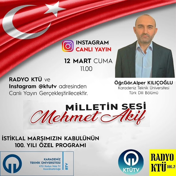 | 11.02.2021 ROCK CANLI PERFORMANS PROGRAMI | 11.02.2021 TRABZONDA KENT TURİZMİ ÜZERİNE SÖYLEŞİ - ENGİN AHMET MUHSIR | 12.03.2021 İSTİKLAL MARŞININ KABULÜ VE MEHMET AKİF ERSOY ÖZEL PROGRAMI- Öğr.Gör.Alper KILIÇOĞLU+KTÜ TV İNSTAGRAM CANLI YAYINI | ||