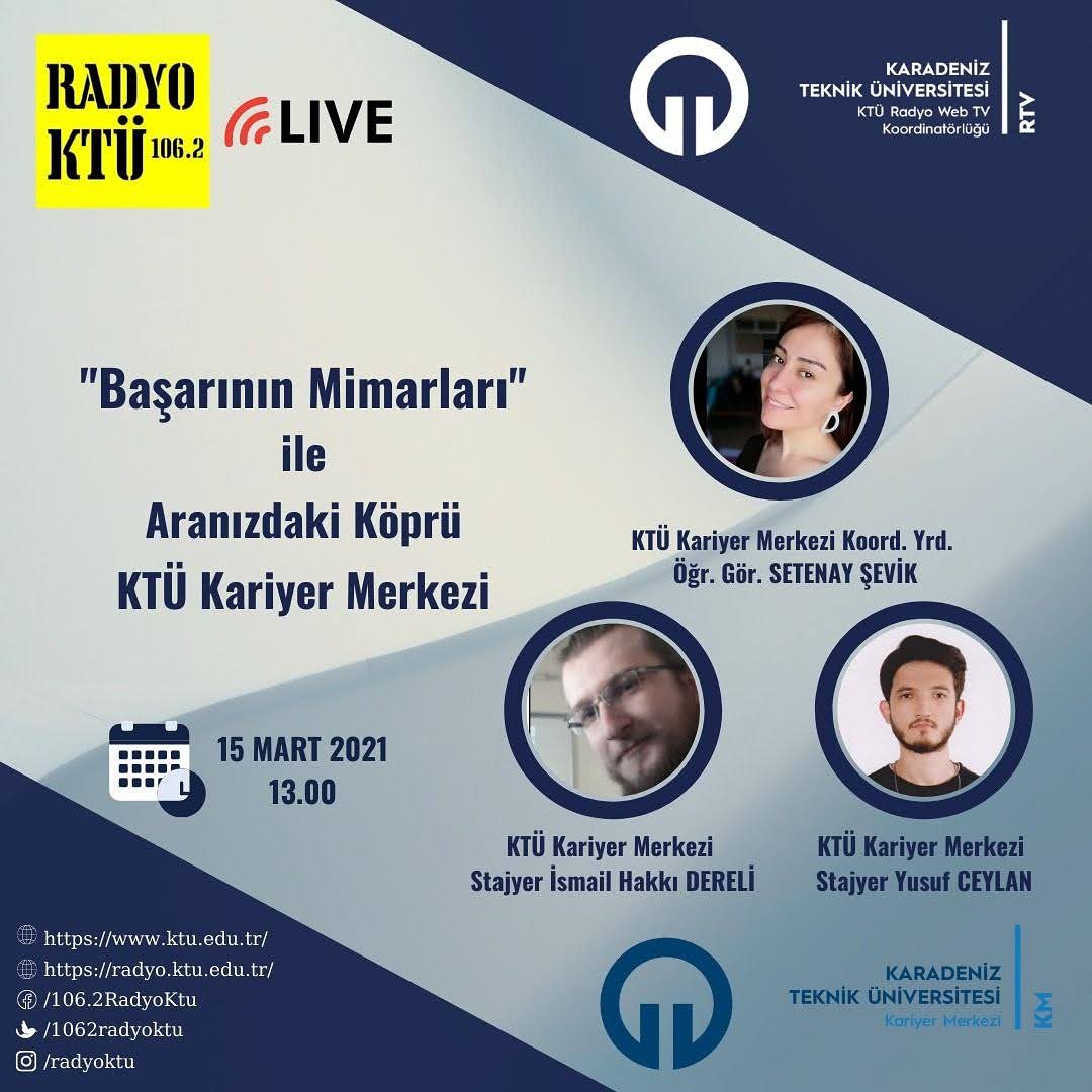 | 12.04.2021 BAŞARININ MİMARLARI İLE ARANIZDAKİ KÖPRÜ KTÜ KARİYER MERKEZİ - ÖĞR.GÖR. SETENAY ŞEVİK KONUK - KTU TV INSTAGRAM CANLI YAYIN | 12.04.2021-KURUMSAL İLETİŞİM ÜZERİNE SÖYLEŞİ- PROF.DR. BAHAR YALIN - KONUK | 13.01.2021 YEDİ BÖLGENİN YEDİ TELİNDEN TÜRKÜLER PROGRAMI | ||