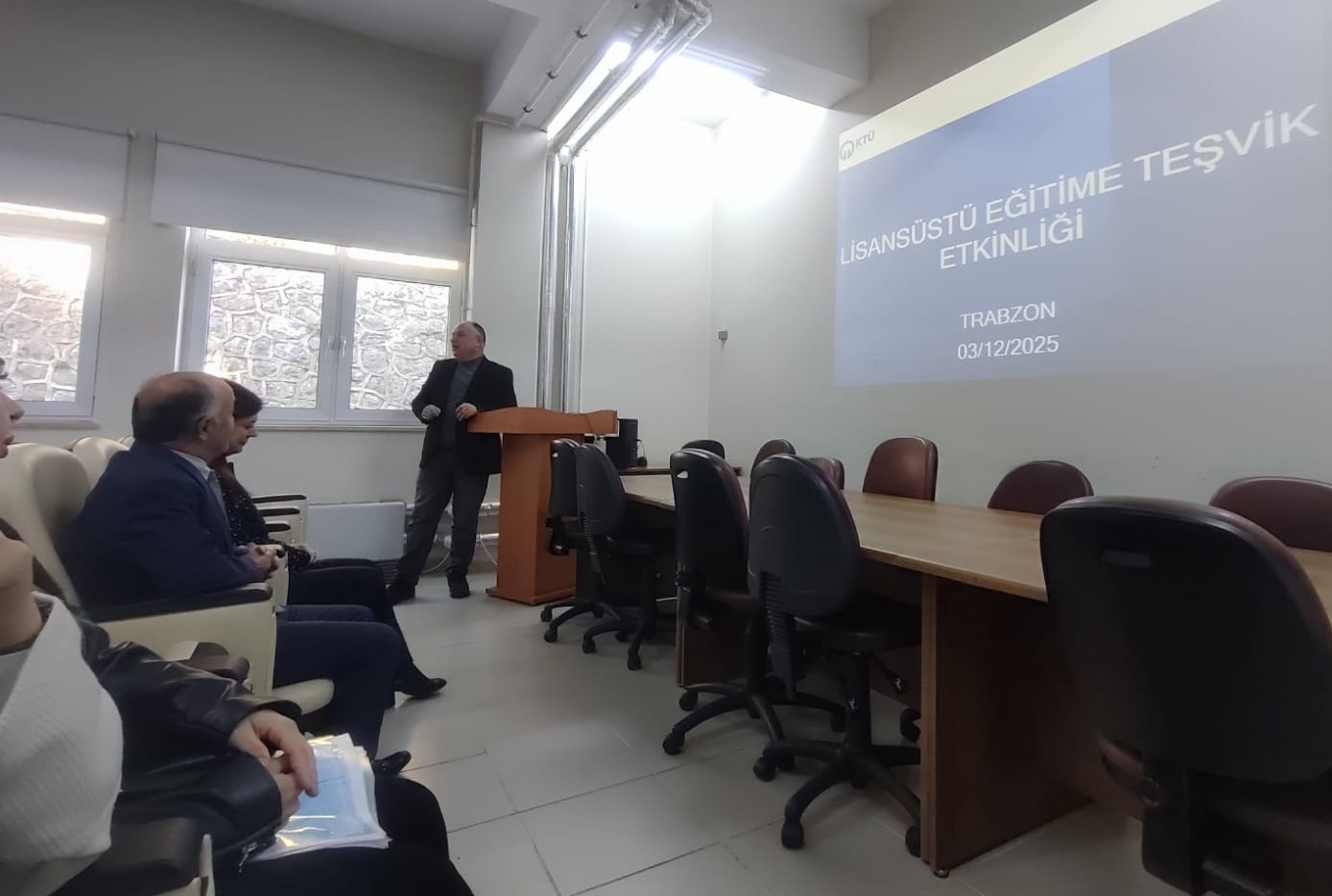 Tıp, Sağlık Bilimleri, Eczacılık, İktisadi İdari Bilimler, ve Edebiyat Fakülteleri ile Fen, Mühendislik, Of Teknoloji ve Sürmene Deniz Bilimleri Fakülteleri Lisans öğrencilerine yönelik "Lisansüstü Eğitimi Teşvik '' etkinliklerimiz Enstitü Müdür Yardımcılarımız Prof. Dr. Selim DEMİR ve Doç. Dr. Aysel ÖZSABAN'ın sunumları ile 03-04 Aralık 2025 tarihlerinde Sağlık Bilimleri Fakültesi Toplantı Salonunda ve Fen Fakültesi Nazım Terzioğlu Amfisi'nde gerçeklerştirildi.