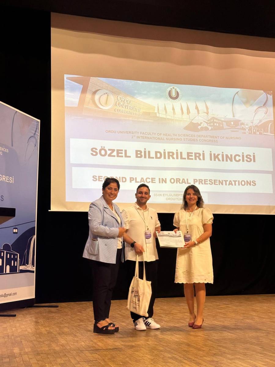 Sağlık Bilimleri Enstitüsü İç Hastalıkları Hemşireliği Anabilim Dalı’ndan Doç. Dr. Seçil GÜLHAN GÜNER, Sağlık Bilimleri Enstitüsü İç Hastalıkları Hemşireliği Anabilim Dalı öğrencisi Hemşire Bahrican GÜVEN ve Hemşirelik Anabilim Dalı Doktora Öğrencisi Arş. Gör. Müge TEZEL'in bilimsel çalışması, 3-6 Eylül 2025 tarihleri arasında Ordu'da düzenlenen 2. Uluslararası Hemşirelik Çalışmaları Kongresi'nde uluslararası düzeyde takdirle karşılandı. Kongreye sunulan 129 bildiri arasından yapılan titiz değerlendirme sonucunda araştırma ekibi, "The 2nd Best Oral Presentation Award" (En İyi İkinci Sözel Bildiri Ödülü)'nün sahibi oldu. Bu prestijli ödül, sunulan bildirinin bilimsel niteliğini ve hemşirelik alanına sunduğu katkıyı uluslararası arenada teyit etmektedir. Araştırma ekibini kutlar, başarılarının devamını dileriz.