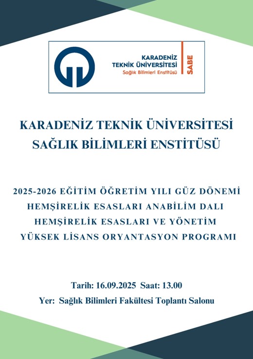 2025-2026 Eğitim Öğretim Yılı Güz Dönemi Hemşirelik Esasları Anabilim Dalı Hemşirelik Esasları ve Yönetim Yüksek Lisans Oryantasyon Programı 16.09.2025 tarihinde saat 13.00’de düzenlenmiştir. Programda anabilim dalının akademik kadrosu ve imkânları tanıtılmış olup akademik danışmanlık, ders seçimi, derslerin işlenmesi, derse devam, sınav ve ders geçme işlemleri açıklanmıştır. Enstitü ve Enstitü Anabilim Dalı web sayfaları tanıtılmış, tezli yüksek lisans süreci anlatılmıştır. Ayrıca akademik takvim öğrencilerle paylaşılmıştır.