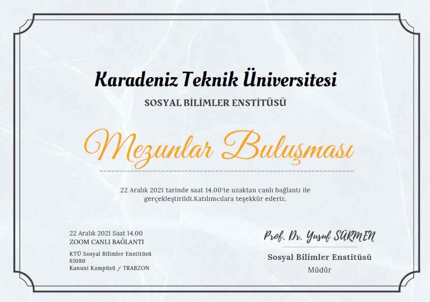 Sosyal Bilimler Enstitüsü 2021 Yılı Mezunlar Buluşması 22 Aralık 2021 tarihinde gerçekleştirildi.