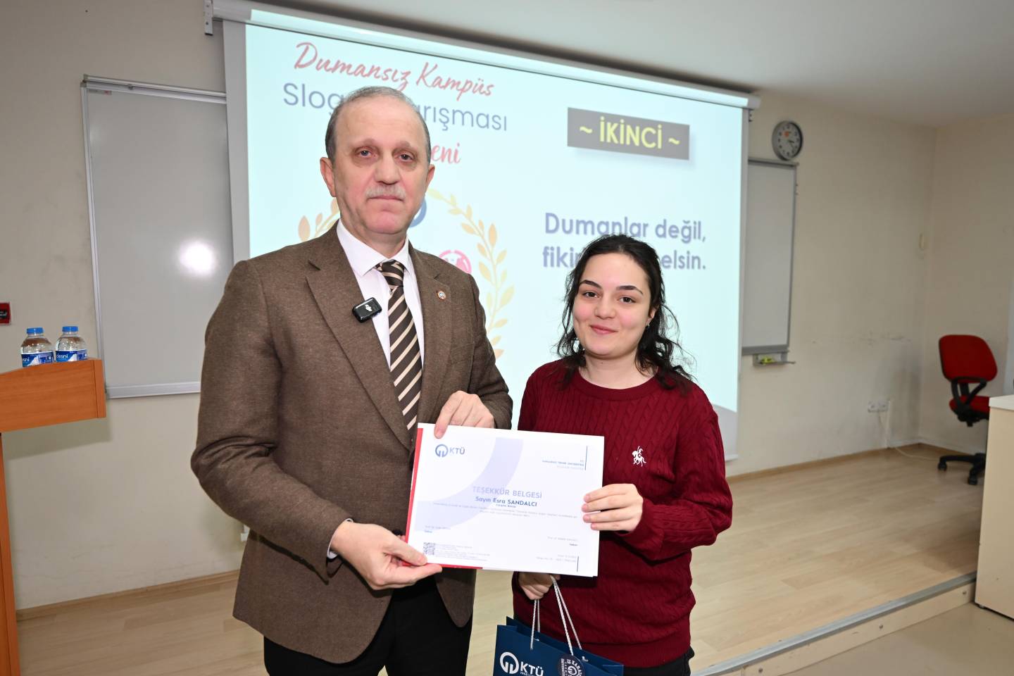 Fakültemiz ve Eczacılık Fakültesi tarafından 16.12.2025 Tarihinde “Dumansız Kampüs Slogan Yarışması” ödül töreni düzenlenmiştir. Törene Sayın Rektörümüz Prof. Dr. Hamdullah Çuvalcı, Rektör Yardımcısı Prof. Dr. Ali Temiz ve Prof. Dr. Bünyamin Er, Üniversite Yönetim Kurulu Üyeleri, Yeşilay Trabzon bölge müdürü Avukat Işıl Demir Güner, fakültelerimizin akademik ve idari personeli ve öğrenciler katılmıştır. Dereceye giren öğrencilerimizin ödülleri Rektörümüz Prof. Dr. Hamdullah ÇUVALCI tarafından takdim edildi.