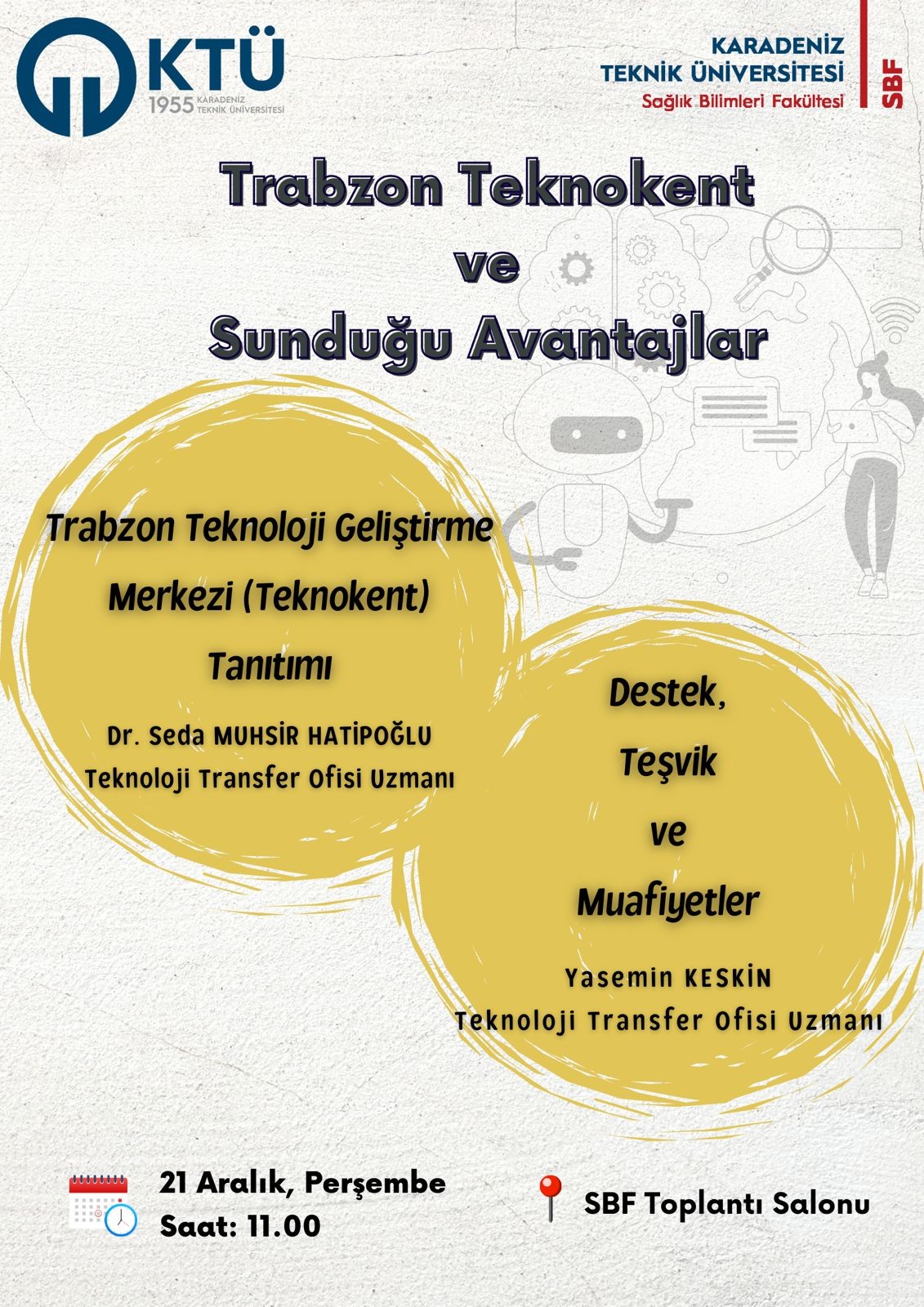 21 Aralık 2023 tarihinde Sayın Dr. Seda Muhsir Hatipoğlu “Trabzon Teknoloji ve Geliştirme Merkezi tanıtımı” ve Sayın Yasemin Keskin “Destek, Teşvik ve Muafiyetler” konularında fakülte öğretim elemanlarımıza yönelik Trabzon Teknokent ve Sunduğu Avantajlar başlıklı bilgilendirme toplantısı gerçekleştirmiştir. Kendilerine fakültemiz adına teşekkürlerimizi sunuyoruz.