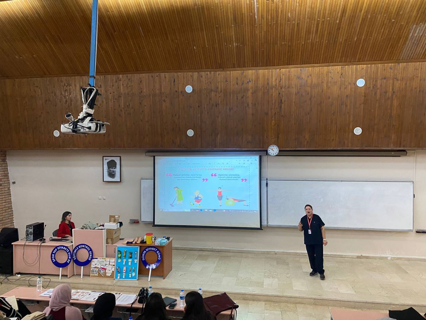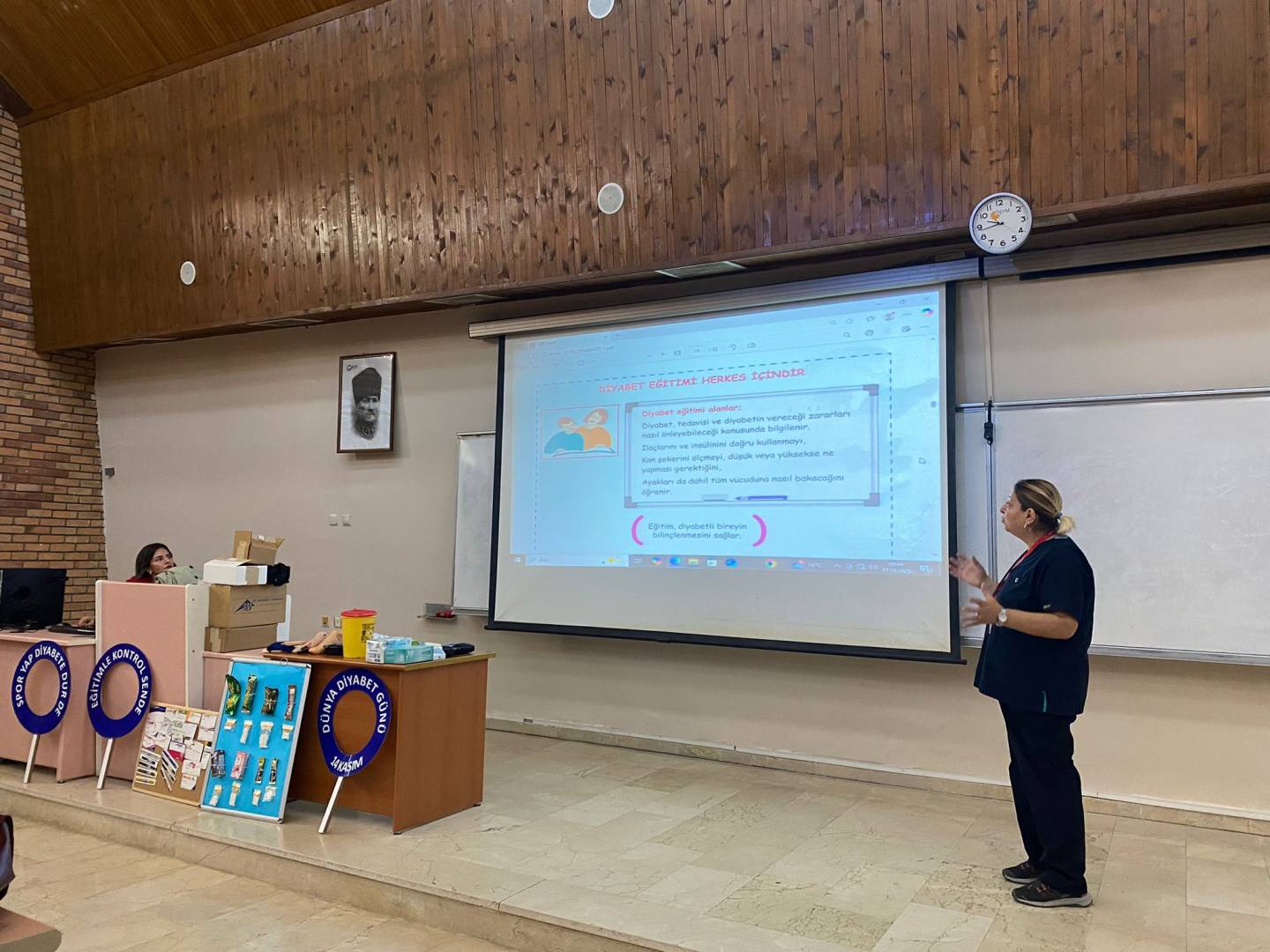 Etkinlikte diyabet, risk faktörleri, tanı ve tedavi yöntemleri ile insülin enjeksiyonu uygulaması gibi konular ele alınmış; öğrencilerin soruları yanıtlanmış ve isteyen öğrencilere insülin enjeksiyonu uygulamaları maket üzerinde yaptırılmıştır.