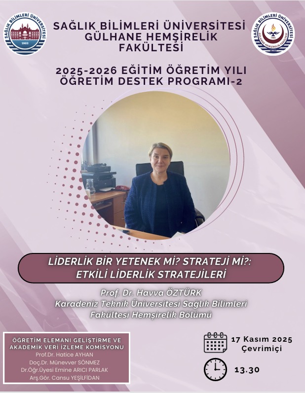Prof. Dr. Havva Öztürk, 17 Kasım 2025’te saat 13:30’da Sağlık Bilimleri Üniversitesi Gülhane Hemşirelik Fakültesi öğretim elemanları ve lisansüstü öğrencilerine yönelik olarak “Liderlik Bir Yetenek Mi, Strateji Mi? Etkili Liderlik Stratejileri” konulu online bir sunum gerçekleştirdi.