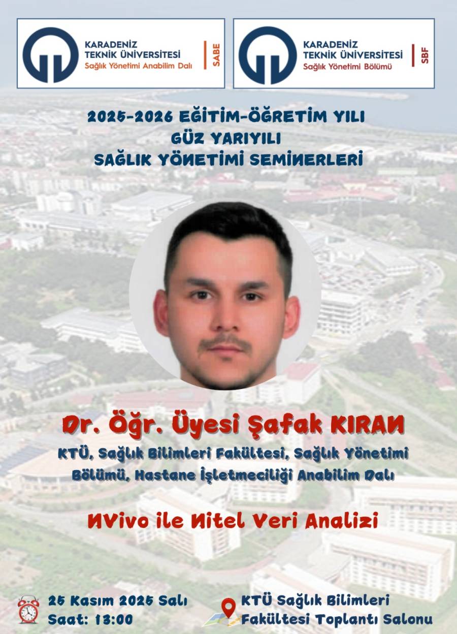 Sağlık Yönetimi Bölüm Seminerleri Kapsamında Bölümümüz Öğretim Üyelerinden Dr. Öğr. Üyesi Şafak Kıran "NViVo ile Nitel Veri Analizi" konulu seminer sunumunu gerçekleştirmiştir.