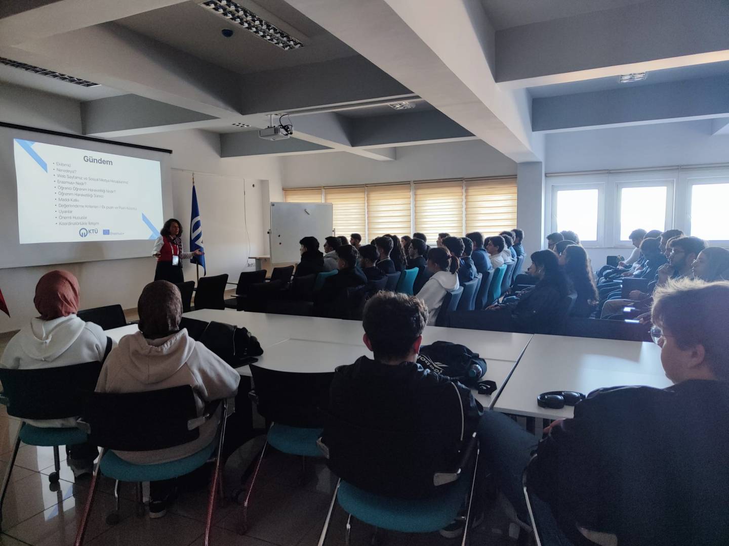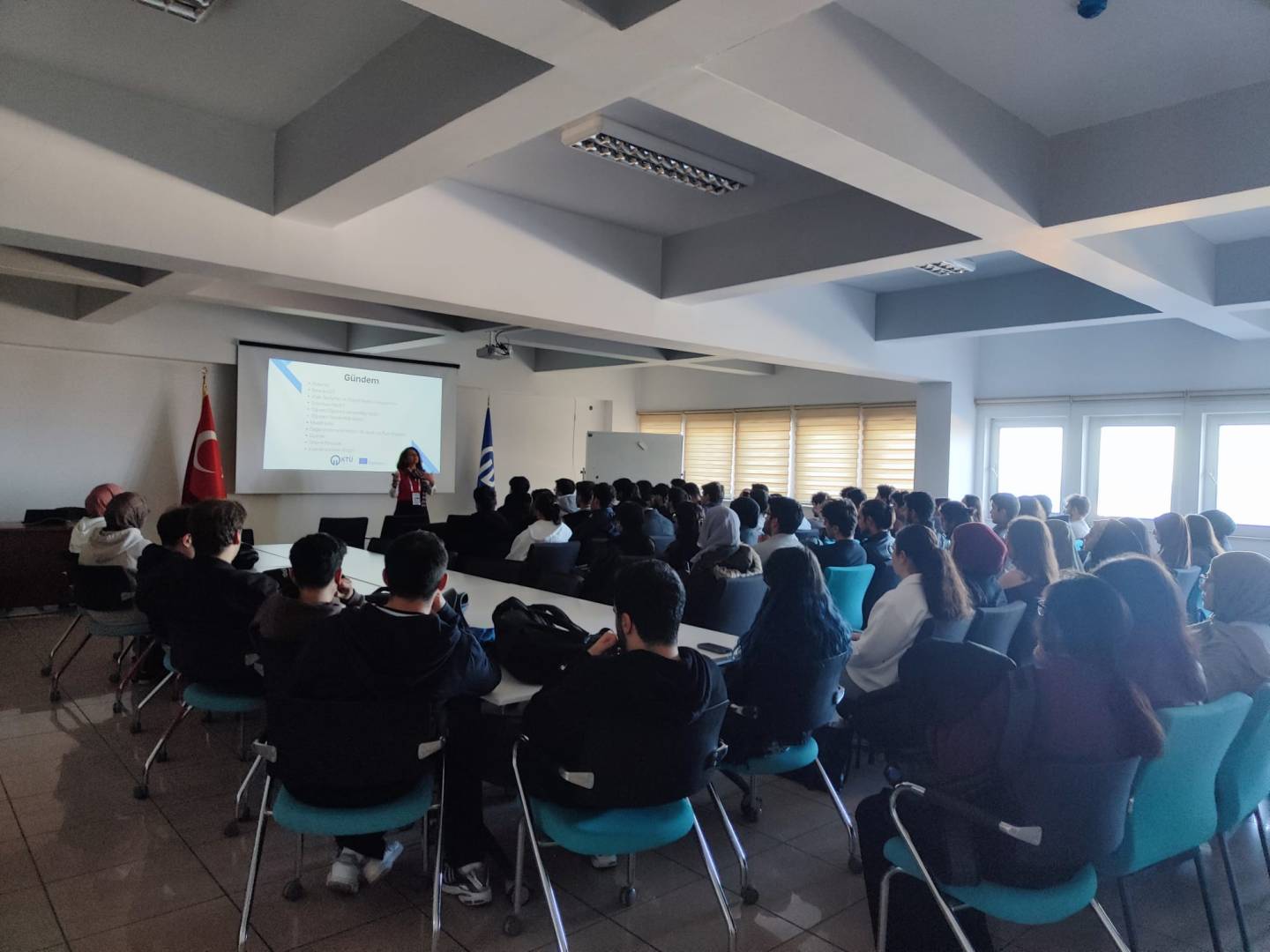 The Black Sea Technical University Office of International Relations held an Erasmus Programs Information Meeting for students in the Software Engineering and Artificial Intelligence, and Data Engineering departments. The event, held in the Career Center Seminar Hall, provided comprehensive information on Erasmus student mobility, application processes, grant conditions, partner universities, and study abroad opportunities.