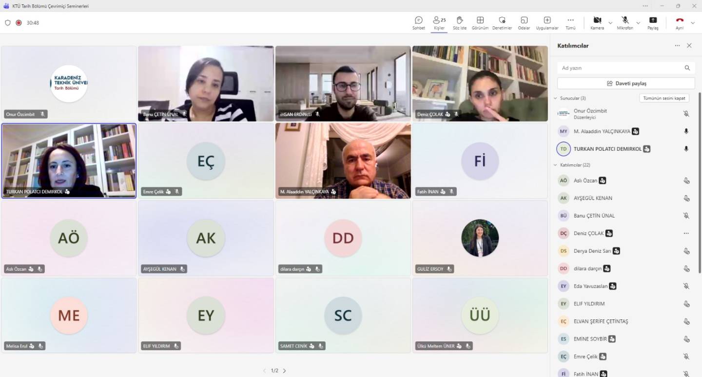 10.12.2025 tarihinde saat 20:00'da Çankırı Karatekin Üniversitesi hocalarından Prof. Dr. Türkan Polatçı Demirkol'un sunumu ile Osmanlı Diplomasisinde Teşrifat Kurumu ve Dönüşümü adlı çevrimiçi seminer KTÜ tarih bölümü hocaları ve öğrencilerinin de katılımı ile gerçekleştirilmiştir.