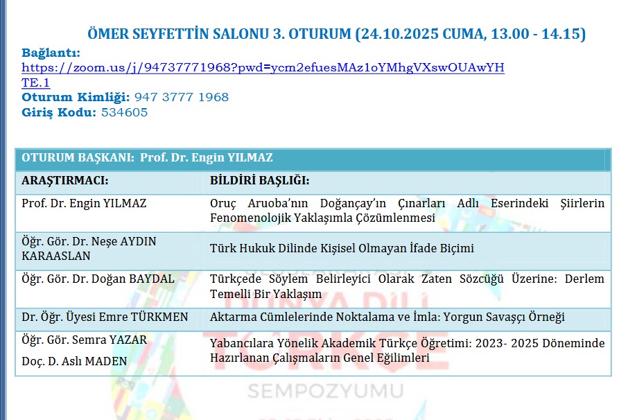 Bölümümüz öğretim üyesi Dr. Emre Türkmen, 17. Uluslararası Dünya Dili Türkçe Sempozyumu'nda ''Aktarma Cümlelerinde Noktalama ve İmla: Yorgun Savaşçı Örneği'' başlıklı bildirisini sunmuştur.