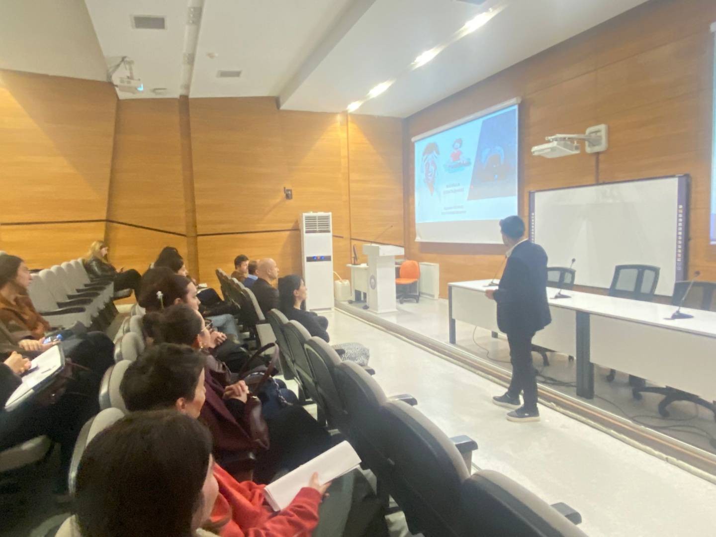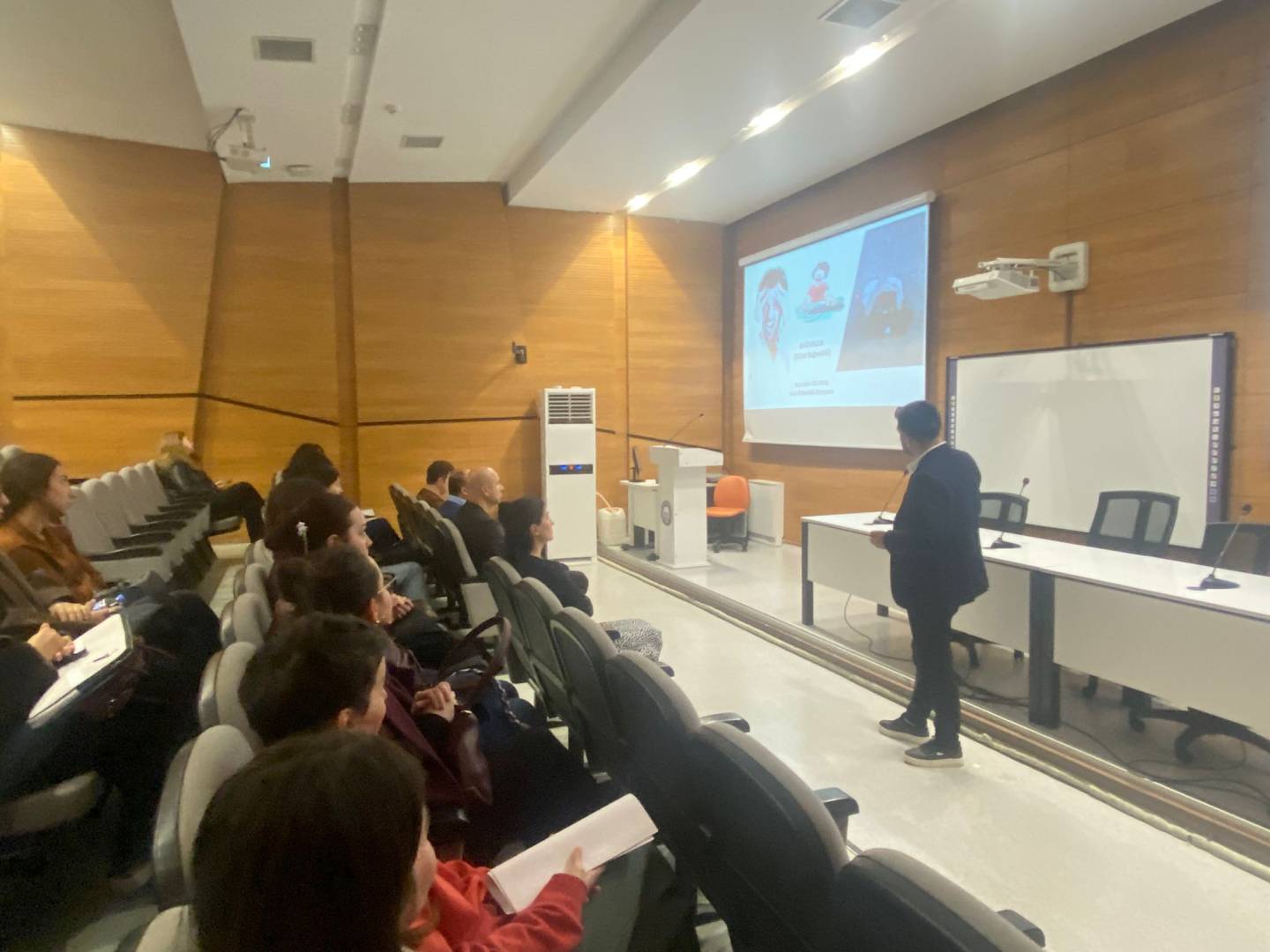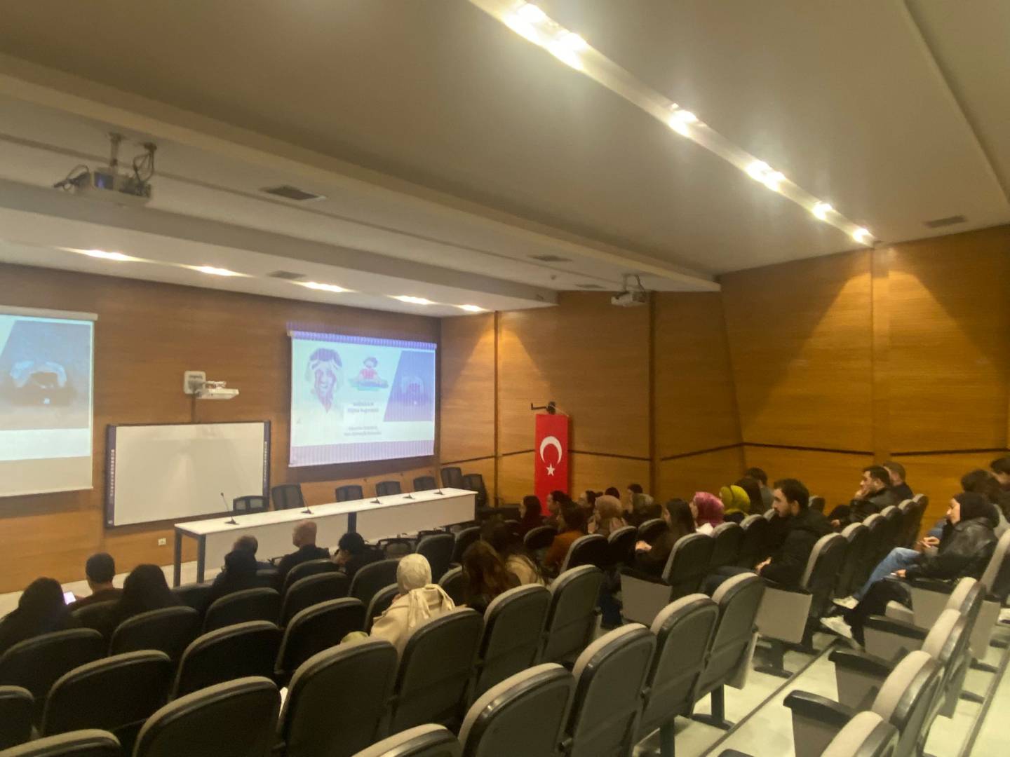 Etkinlikte, bölüm öğrencilerimiz Müberra Gül Coğan ve Sudenaz Küçükali, Türk işaret dili, işitme engellilerin iletişim sorunları ve toplumsal farkındalık konularında sunum yapmıştır.