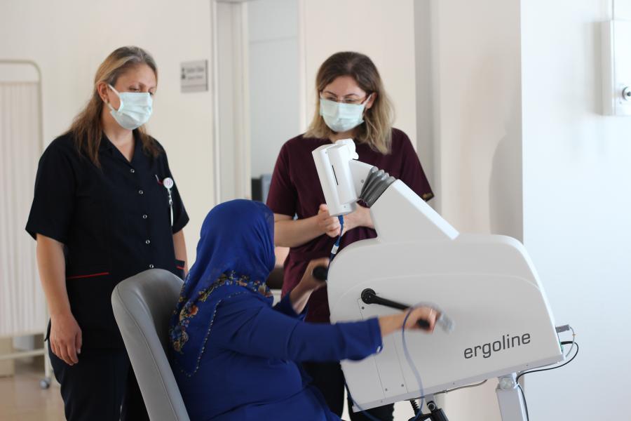 Dr. Öğr. Üyesi Hanife Baykal ŞAHİN yönetimindeki ekip tarafından Kol Ergometre ve Bisiklet Ergometre tedavisi ile birlikte Aerobik Egzersiz Programı uygulanan hasta, oksijen bağımlılığından kurtuldu. Solunum egzersizleri ve ev egzersizi gibi ilave pek çok aşamayı içeren tedavi süreci, her hastaya özel olarak planlanıp uygulanmaktadır. Farabi Hastanesi’ne tekerlekli sandalye ve oksijen tüpü takviyesiyle gelen hasta, tedavisine artık yardım almadan rahatlıkla gidip gelebilmektedir. Üniversitemiz Farabi Hastanesi bünyesine yakın zamanda kazandırılan Kardiyopulmoner Rehabilitasyon Merkezi hem bölge illerimizden gelen hastalara hem de uluslararası pek çok hastaya şifa dağıtmaya devam etmektedir.